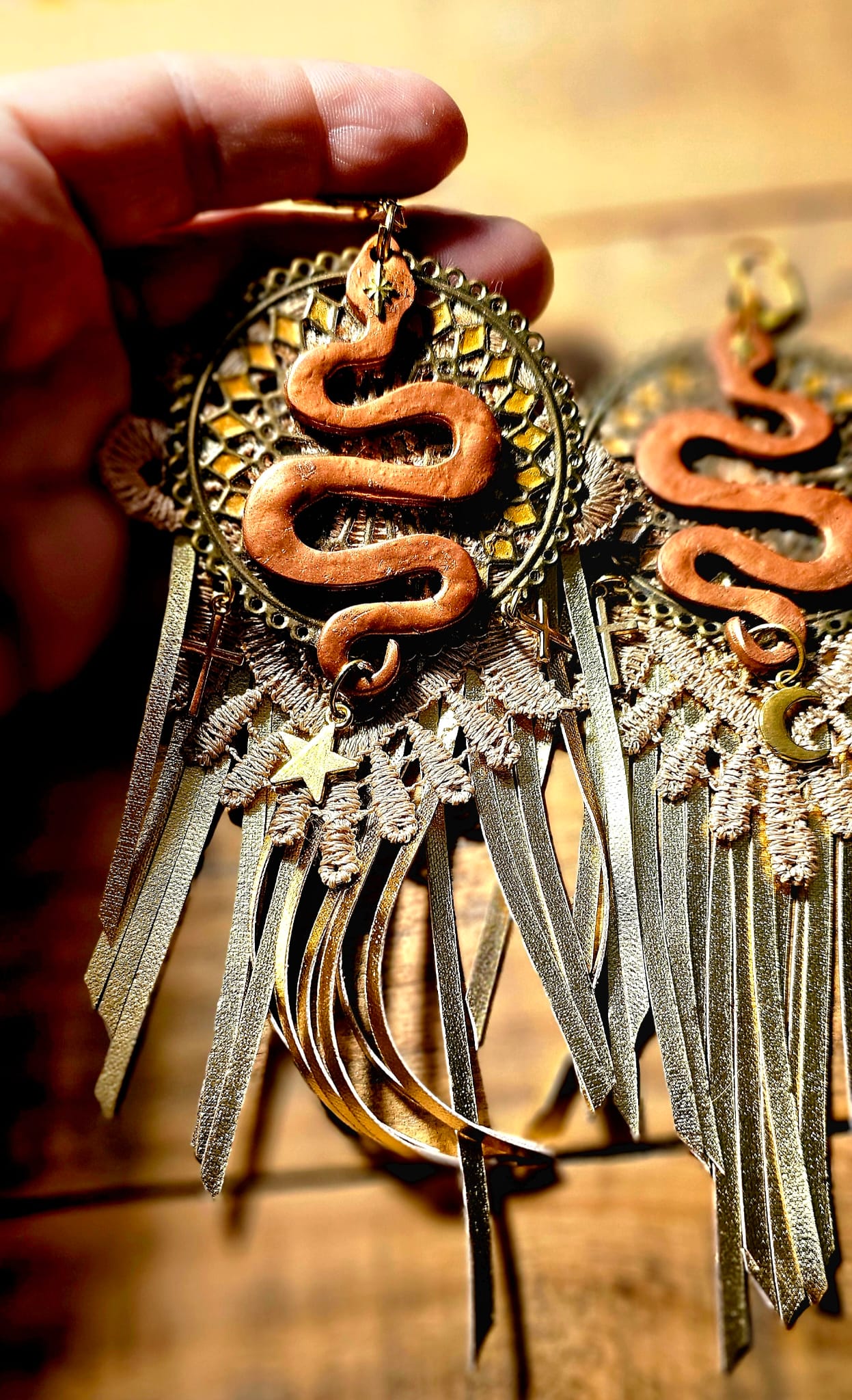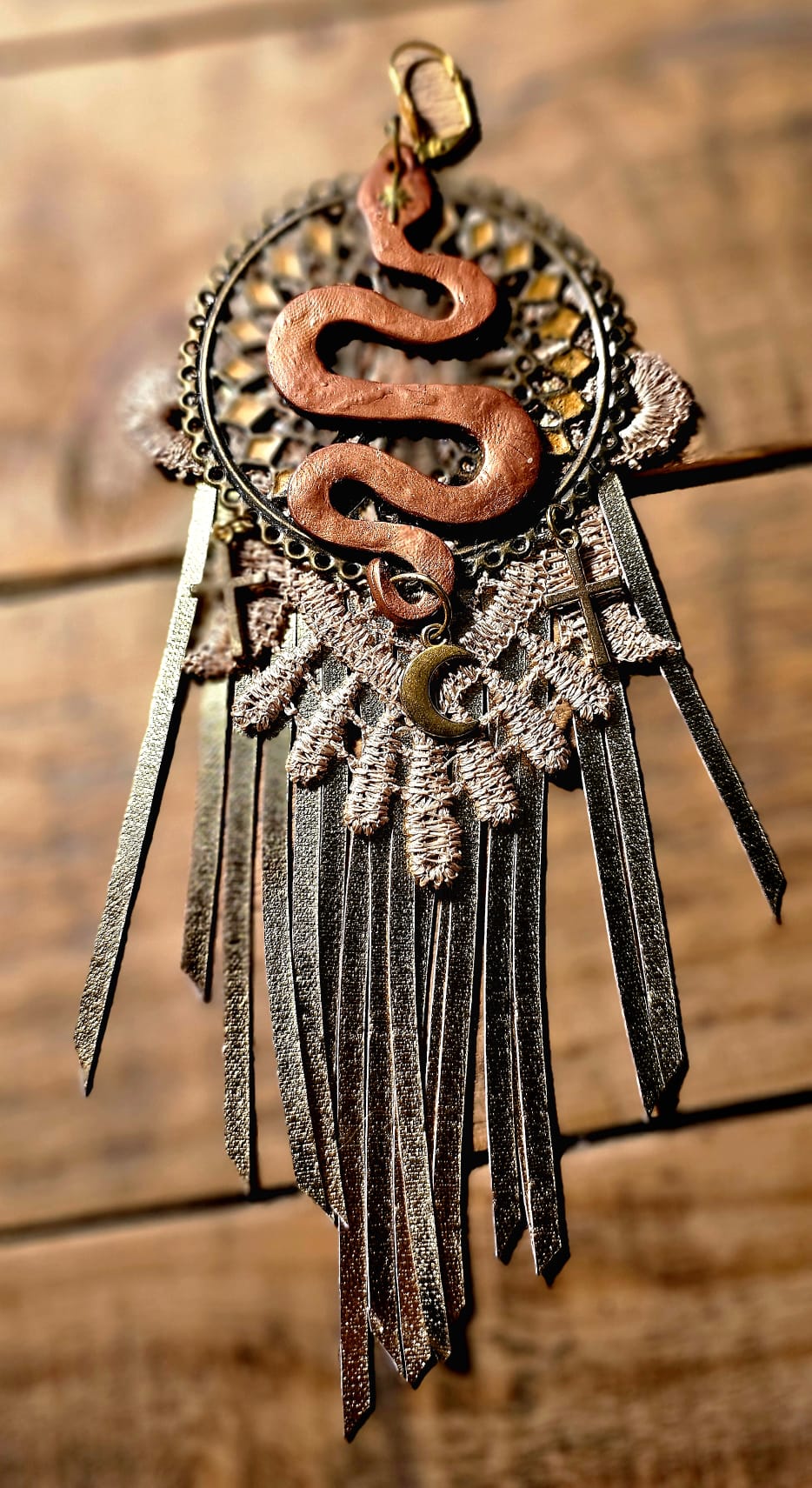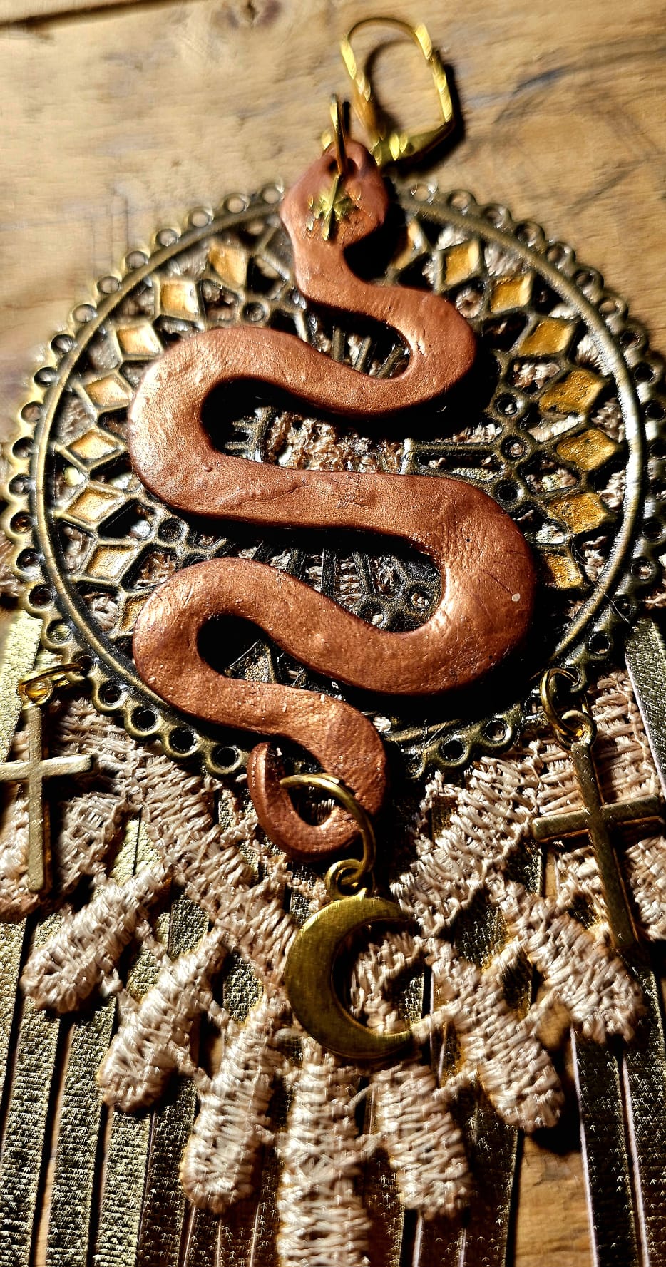 Laissez-vous séduire par la puissance mystique du bijou Divine 4, une création sculpturale d’exception. Son serpent, façonné à la main en argile polymère d’un somptueux cuivre métallisé, incarne force et protection. La dentelle en coton doré apporte une touche de raffinement, tandis que de longues franges en cuir or insufflent un mouvement élégant et aérien. Une pièce unique, pensée pour sublimer votre style avec éclat et caractère.