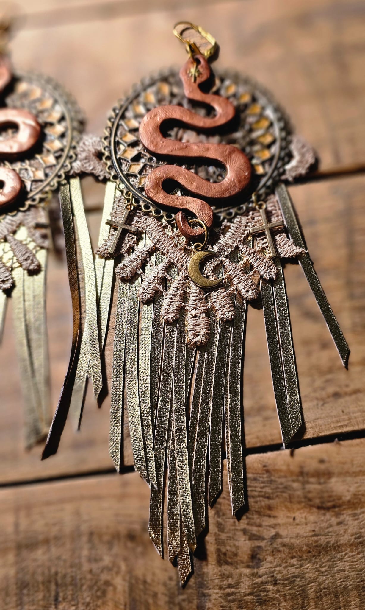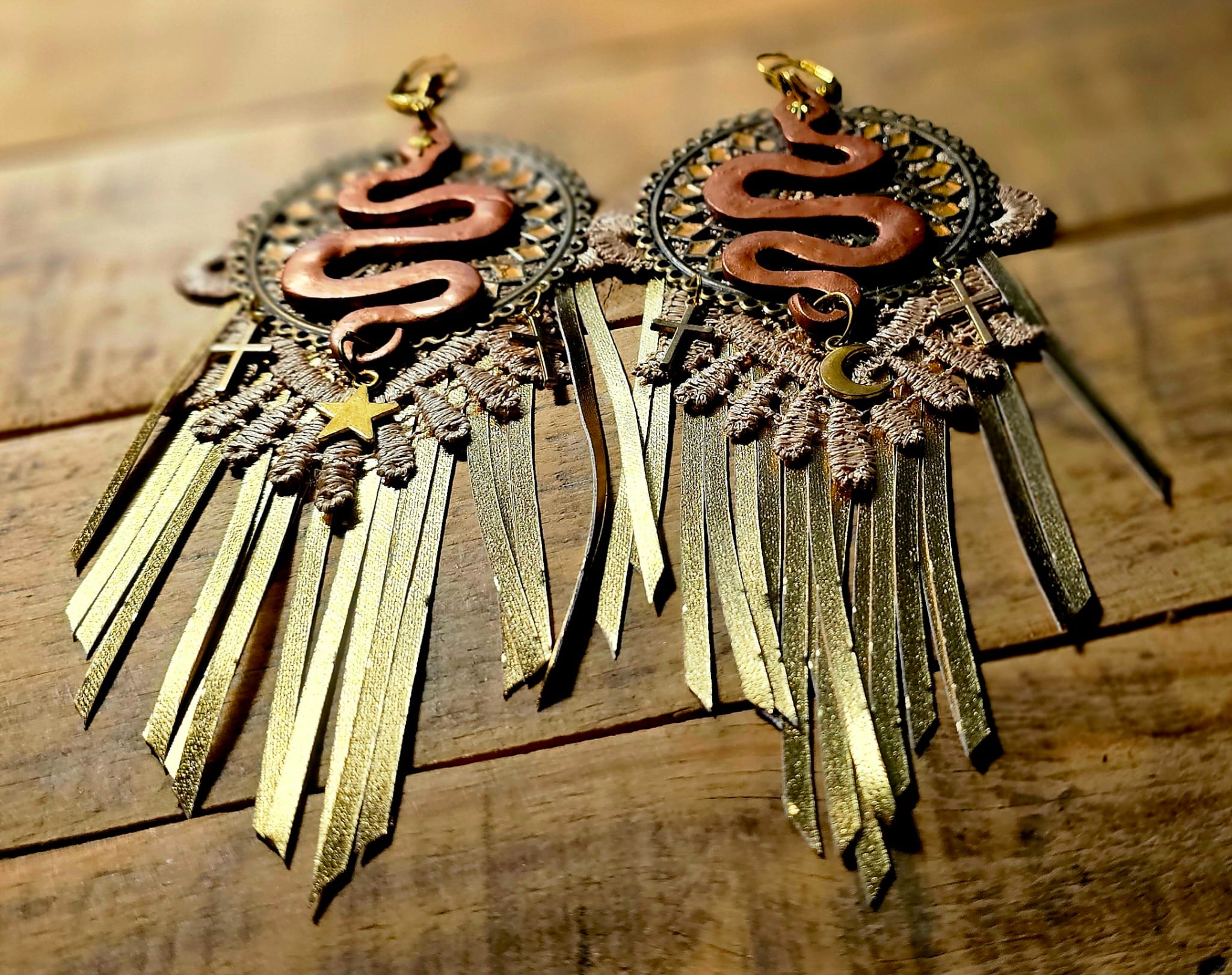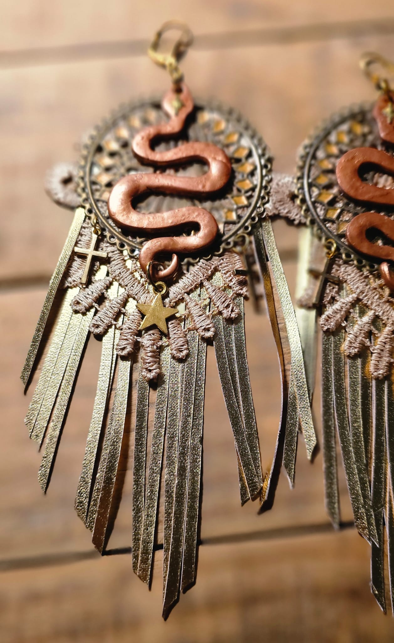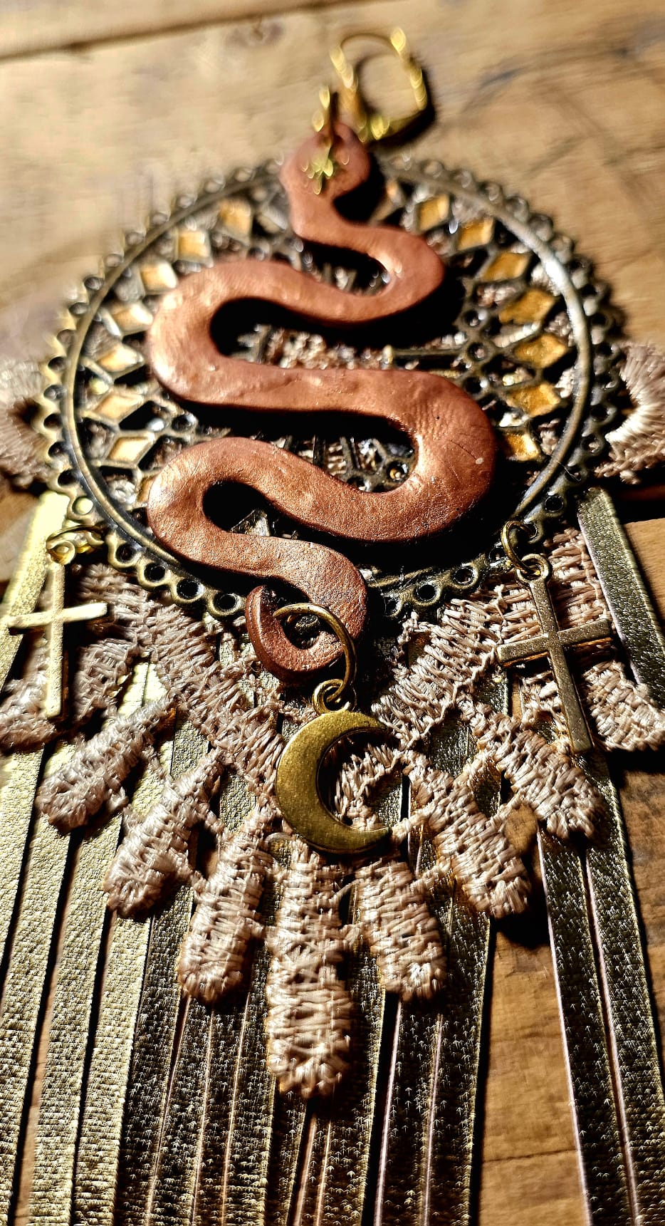 Laissez-vous séduire par la puissance mystique du bijou Divine 4, une création sculpturale d’exception. Son serpent, façonné à la main en argile polymère d’un somptueux cuivre métallisé, incarne force et protection. La dentelle en coton doré apporte une touche de raffinement, tandis que de longues franges en cuir or insufflent un mouvement élégant et aérien. Une pièce unique, pensée pour sublimer votre style avec éclat et caractère.