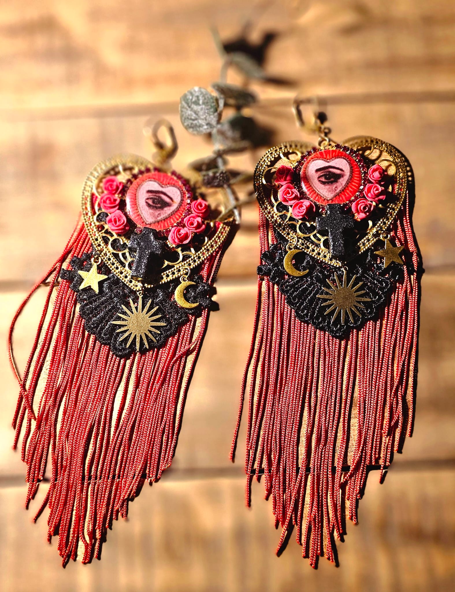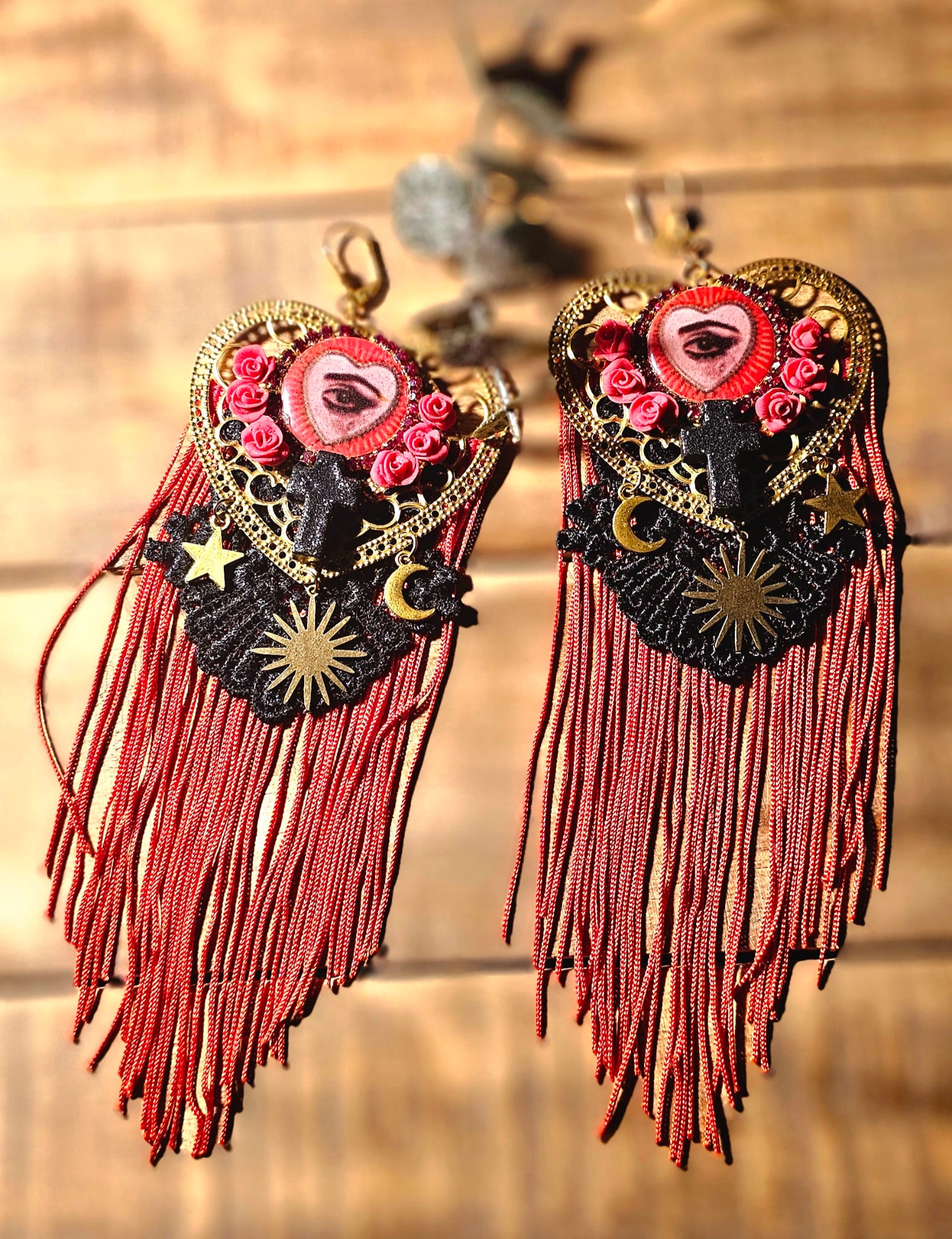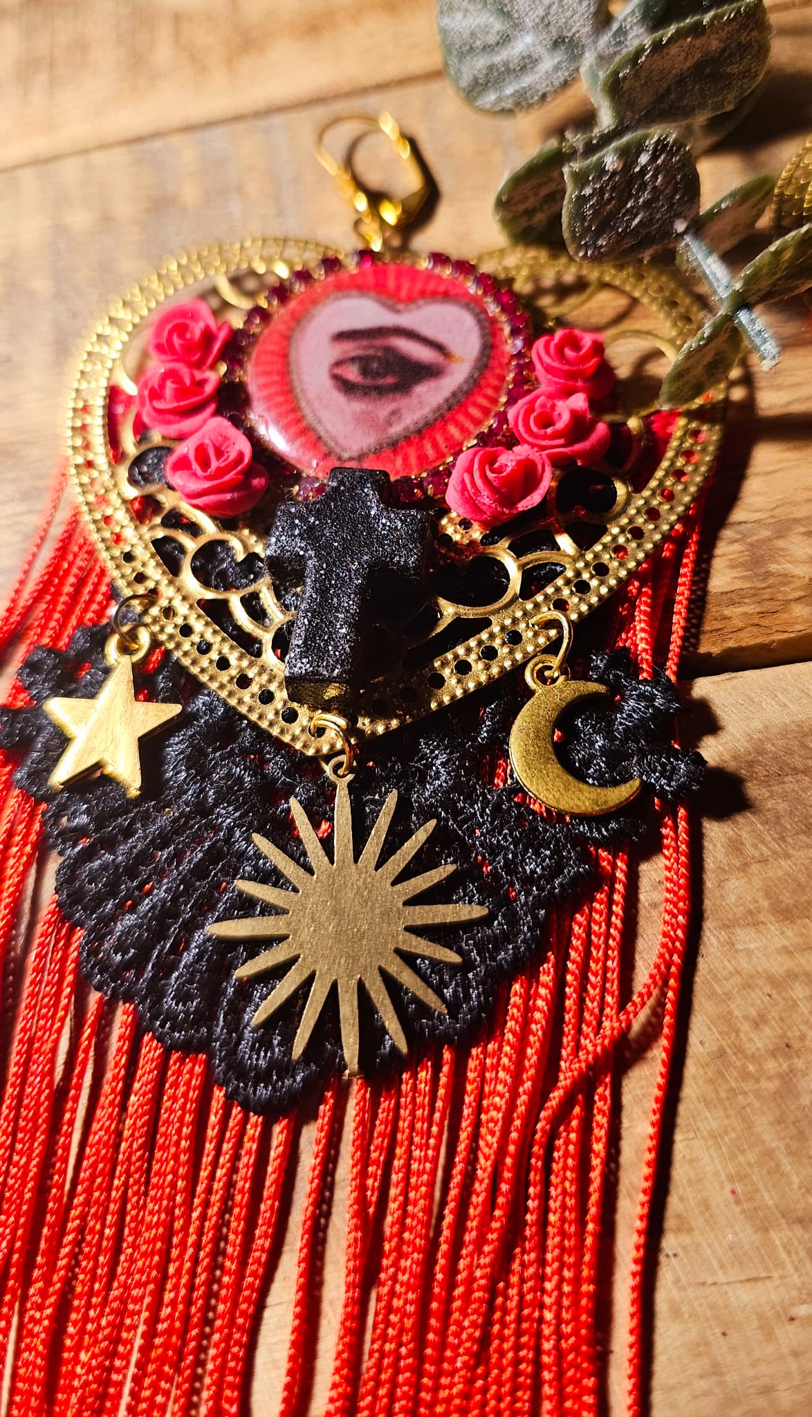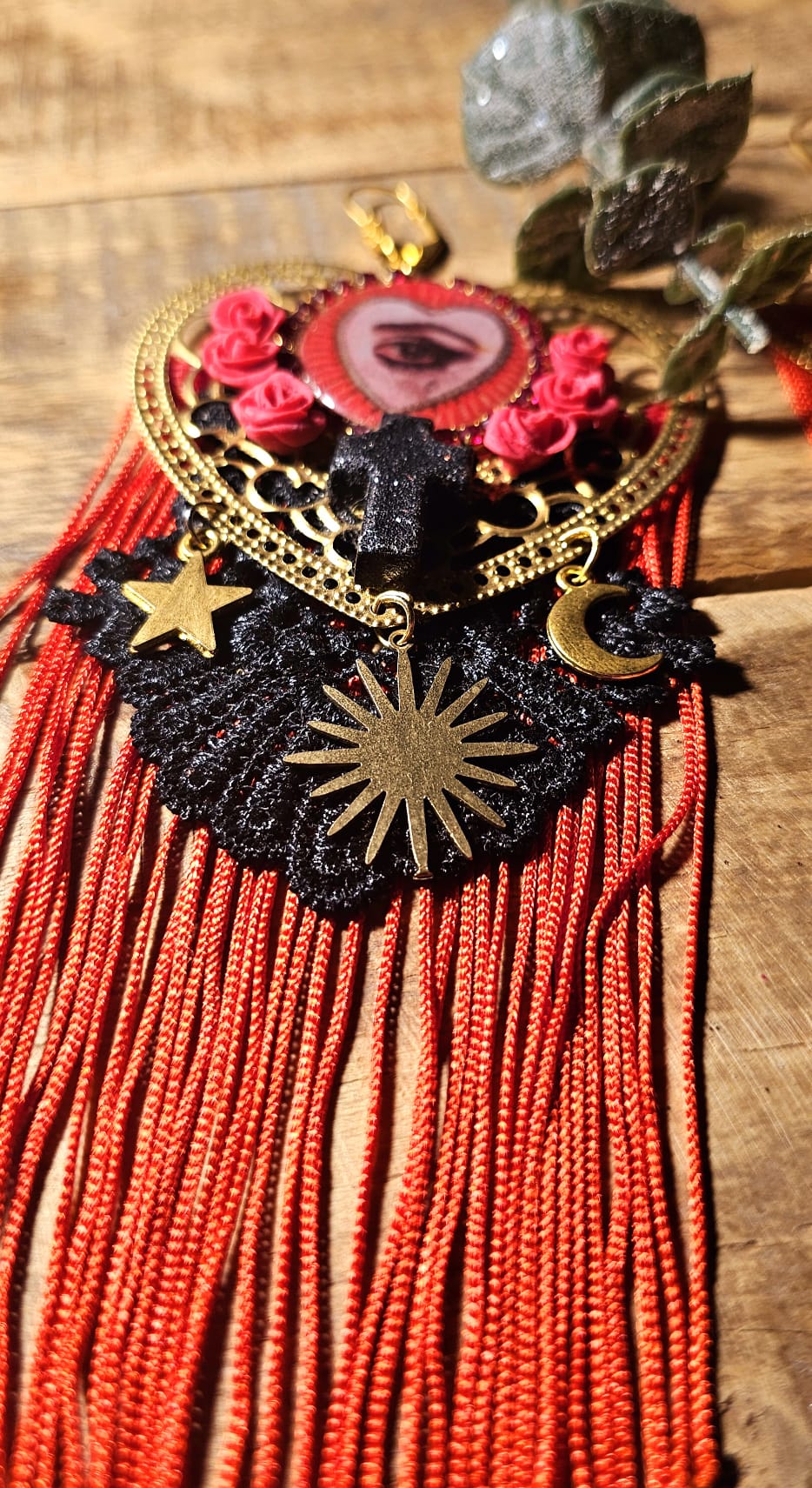 Laissez-vous envoûter par l’élégance mystique des boucles d’oreilles Divine, véritables pièces d’artisanat. Un support en métal doré met en valeur une croix en bois, peinte et pailletée à la main dans un noir profond. Des franges en soie rouge, délicates et fluides, apportent un mouvement gracieux, tandis que des dentelles noires et de somptueuses roses sculptées en pâte polymère viennent sublimer cette création unique. Une pastille en bois, ornée d’une image numérique resinée signée Les Francines, parachève cette œuvre d’exception, légère et raffinée.