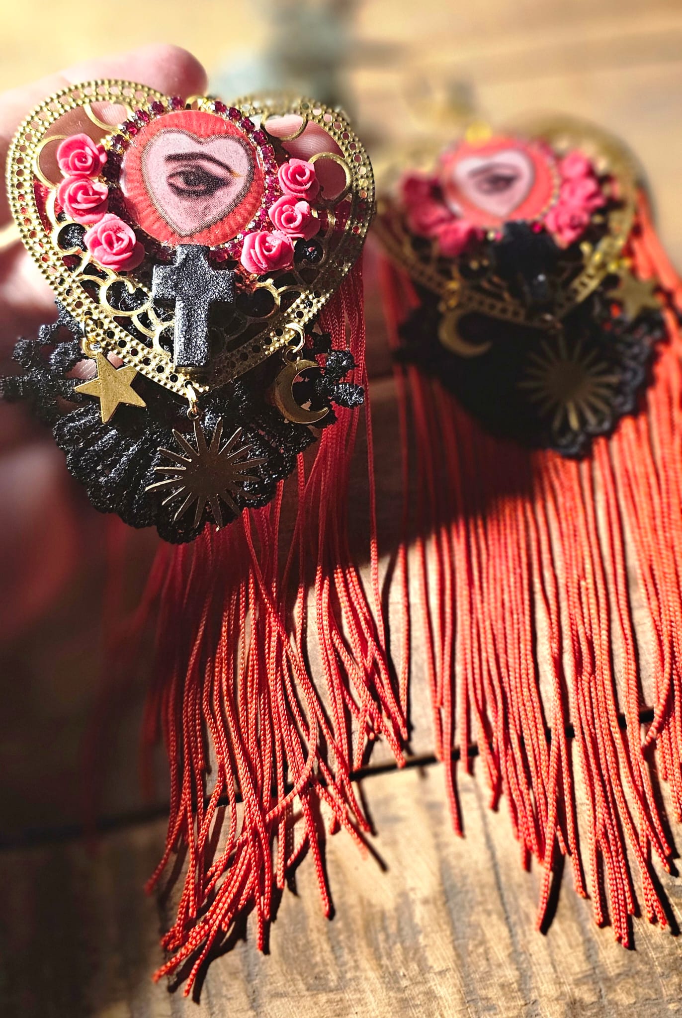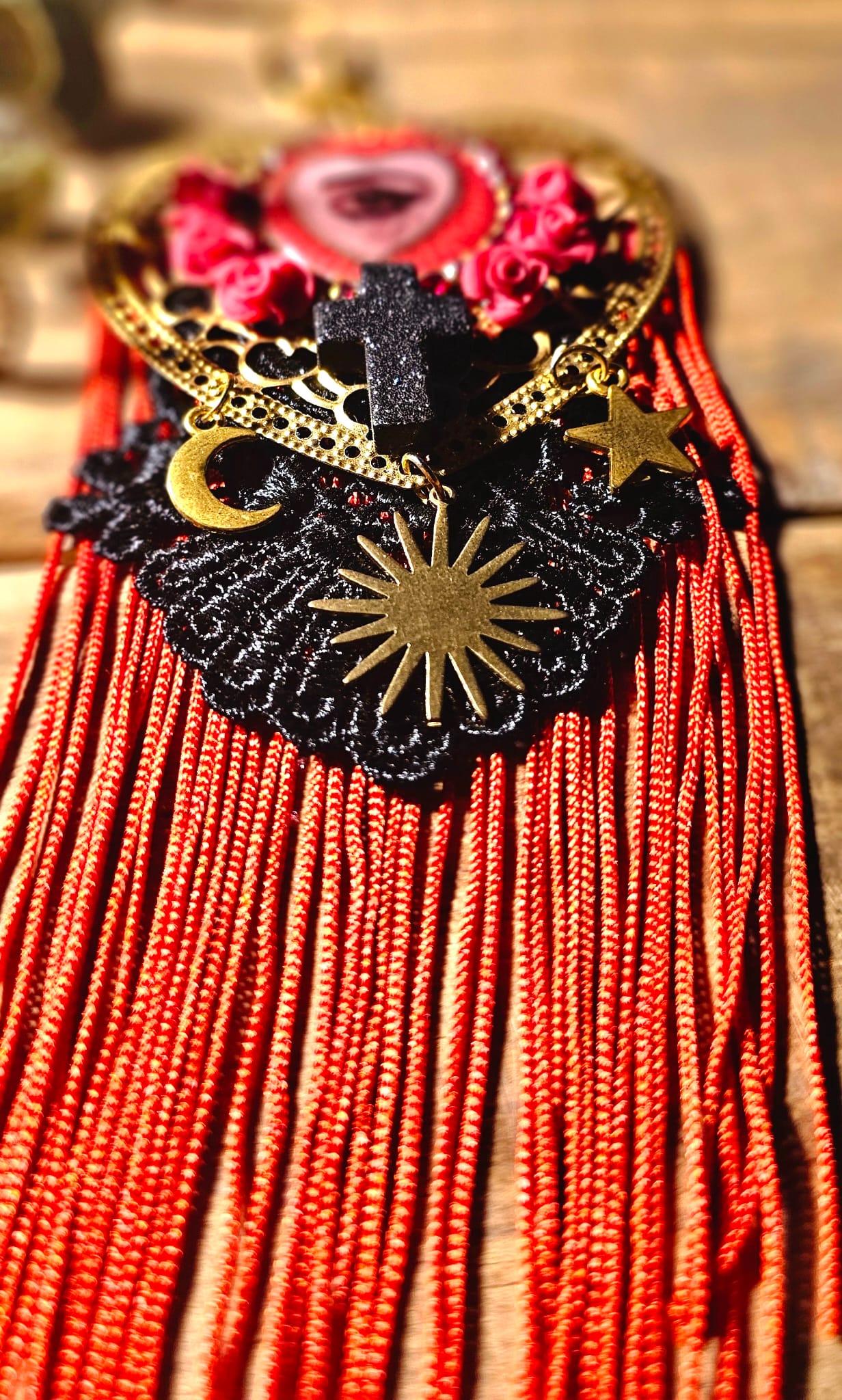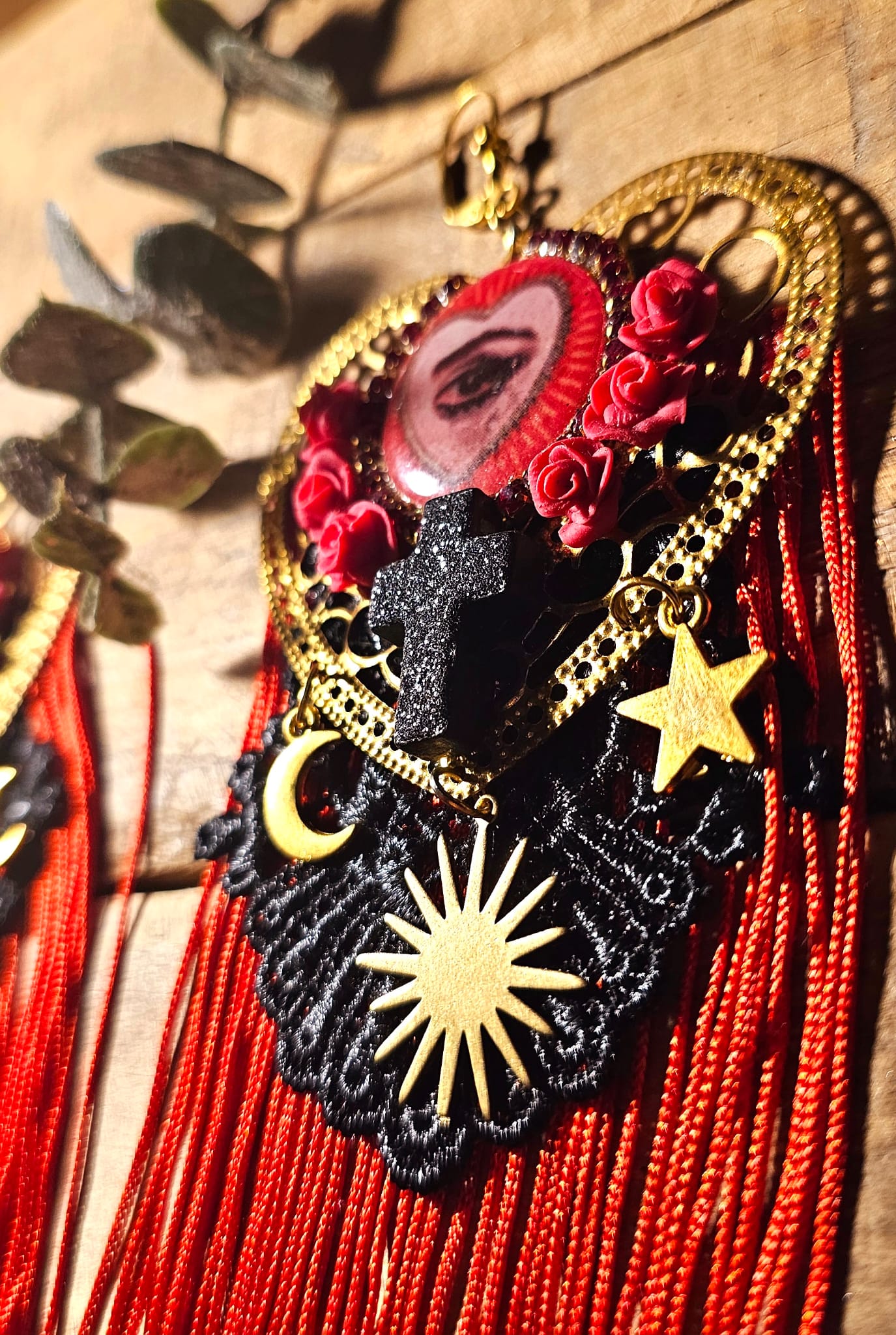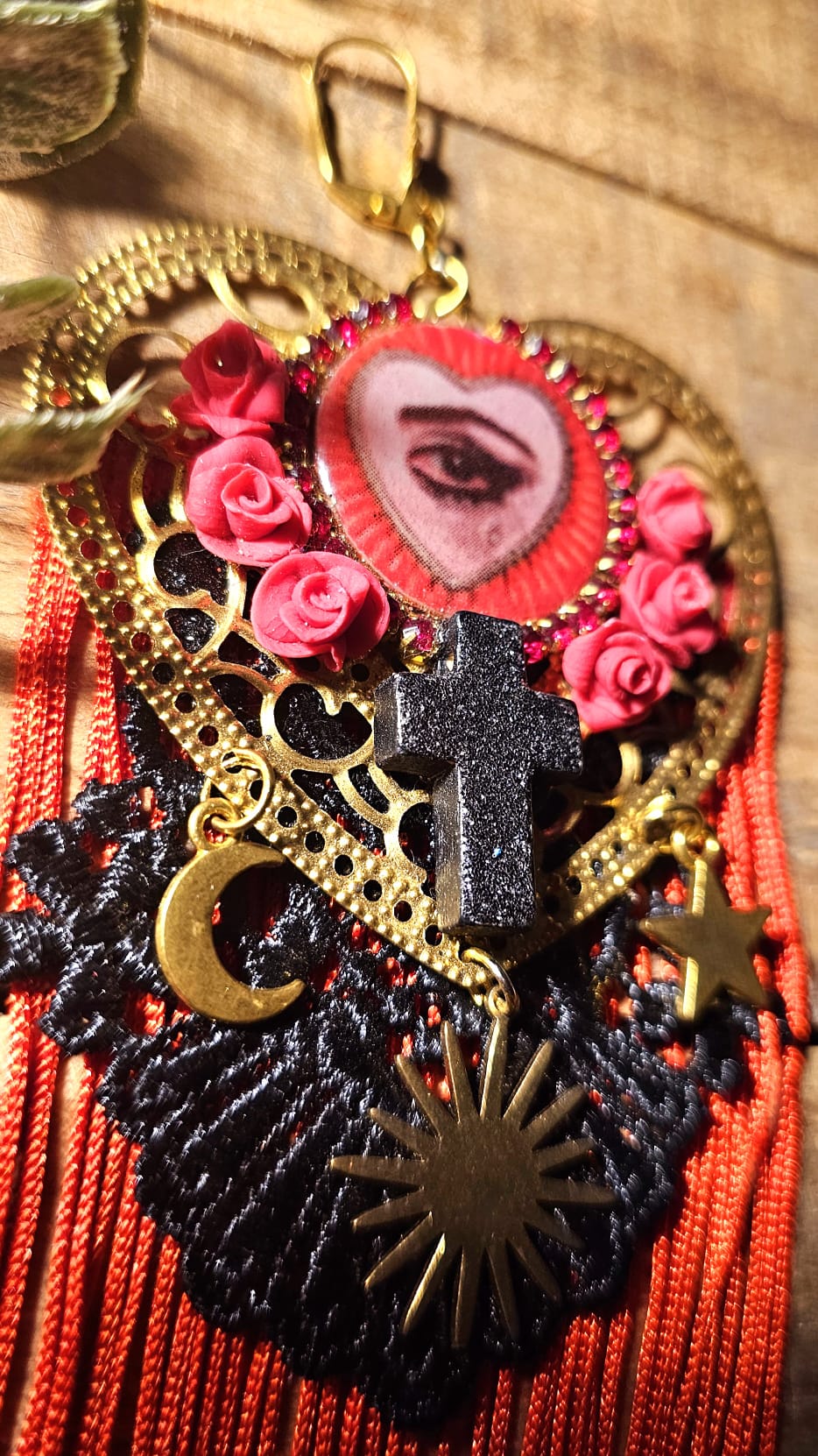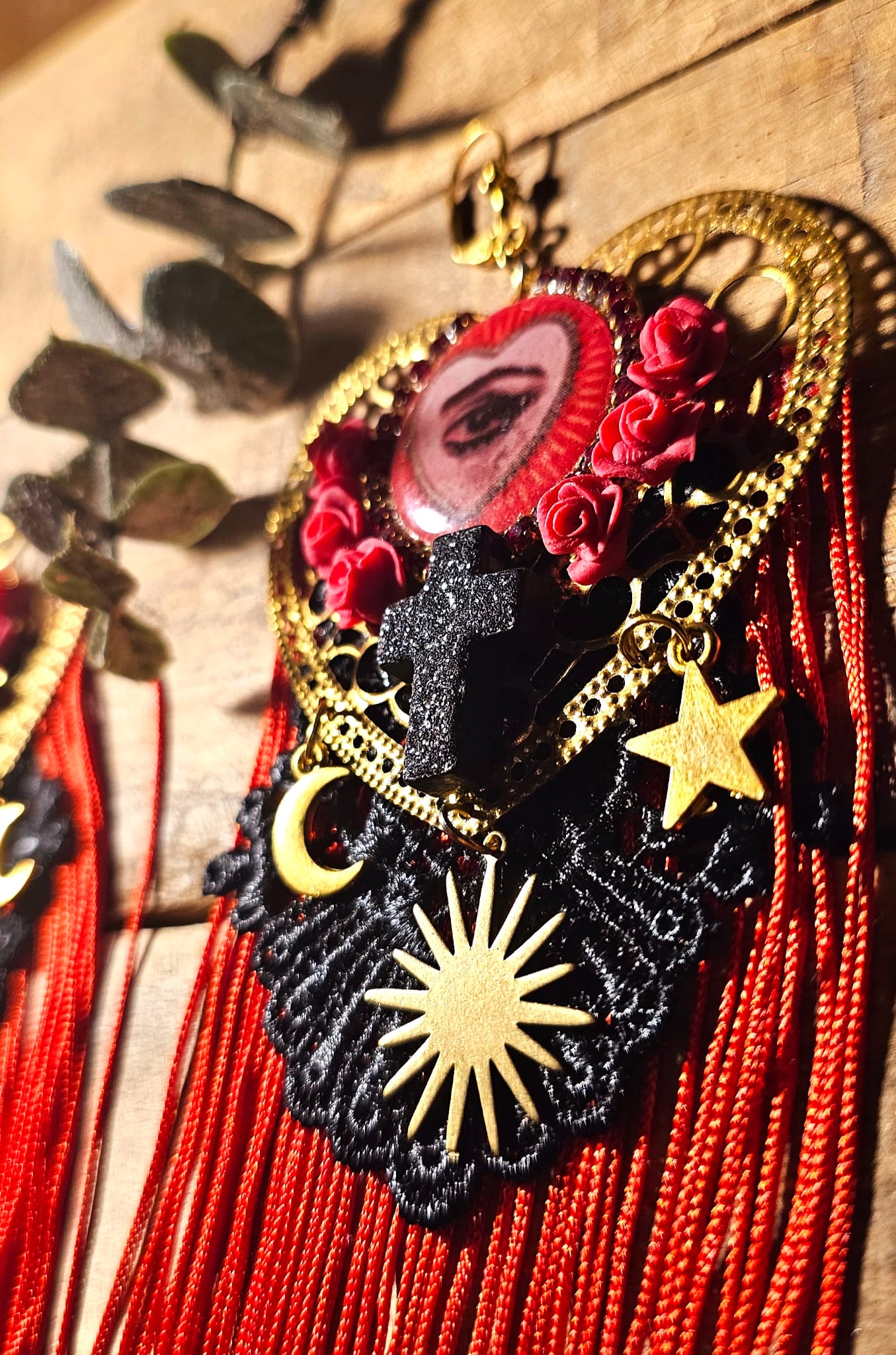 Laissez-vous envoûter par l’élégance mystique des boucles d’oreilles Divine, véritables pièces d’artisanat. Un support en métal doré met en valeur une croix en bois, peinte et pailletée à la main dans un noir profond. Des franges en soie rouge, délicates et fluides, apportent un mouvement gracieux, tandis que des dentelles noires et de somptueuses roses sculptées en pâte polymère viennent sublimer cette création unique. Une pastille en bois, ornée d’une image numérique resinée signée Les Francines, parachève cette œuvre d’exception, légère et raffinée.