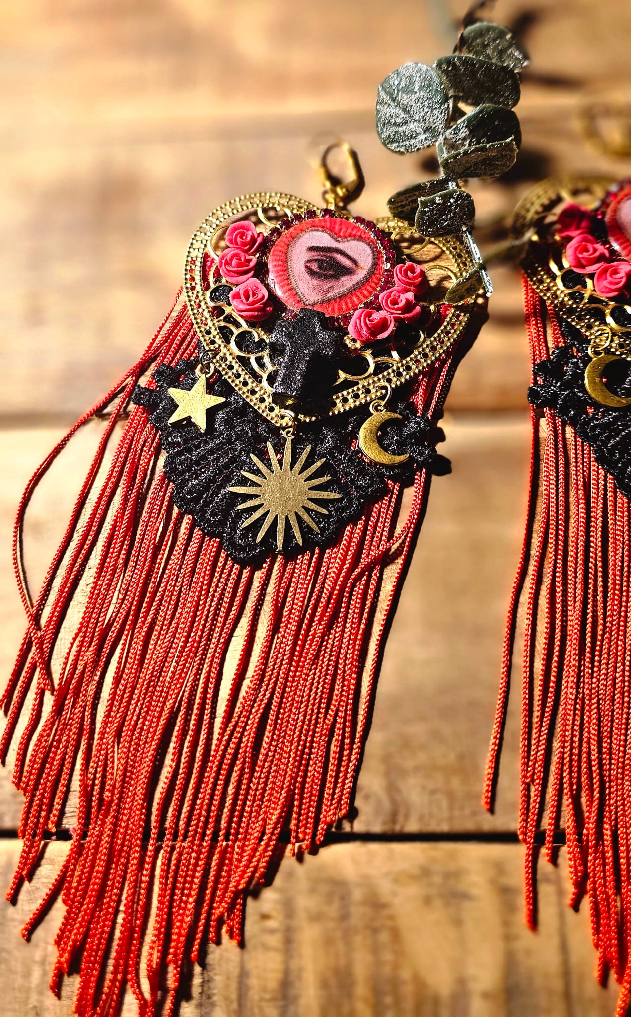 Les franges en soie rouge, à la fois légères et fluides, confèrent une élégance dramatique à cette pièce unique. Des dentelles noires, finement travaillées, viennent accentuer le raffinement de l’ensemble, tandis que des roses sculptées en pâte polymère ajoutent une touche romantique et sculpturale. Une pastille en bois, sublimée par une image numérique resinée et signée Les Francines, parachève ce bijou en lui conférant une identité unique et précieuse. Ultra légères malgré leur apparente opulence, ces boucles d’oreilles sont idéales pour celles qui souhaitent affirmer leur style avec intensité et élégance.
