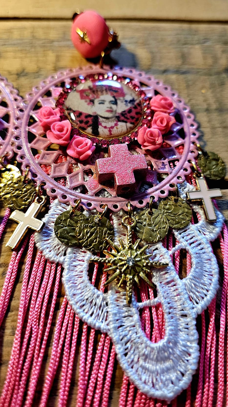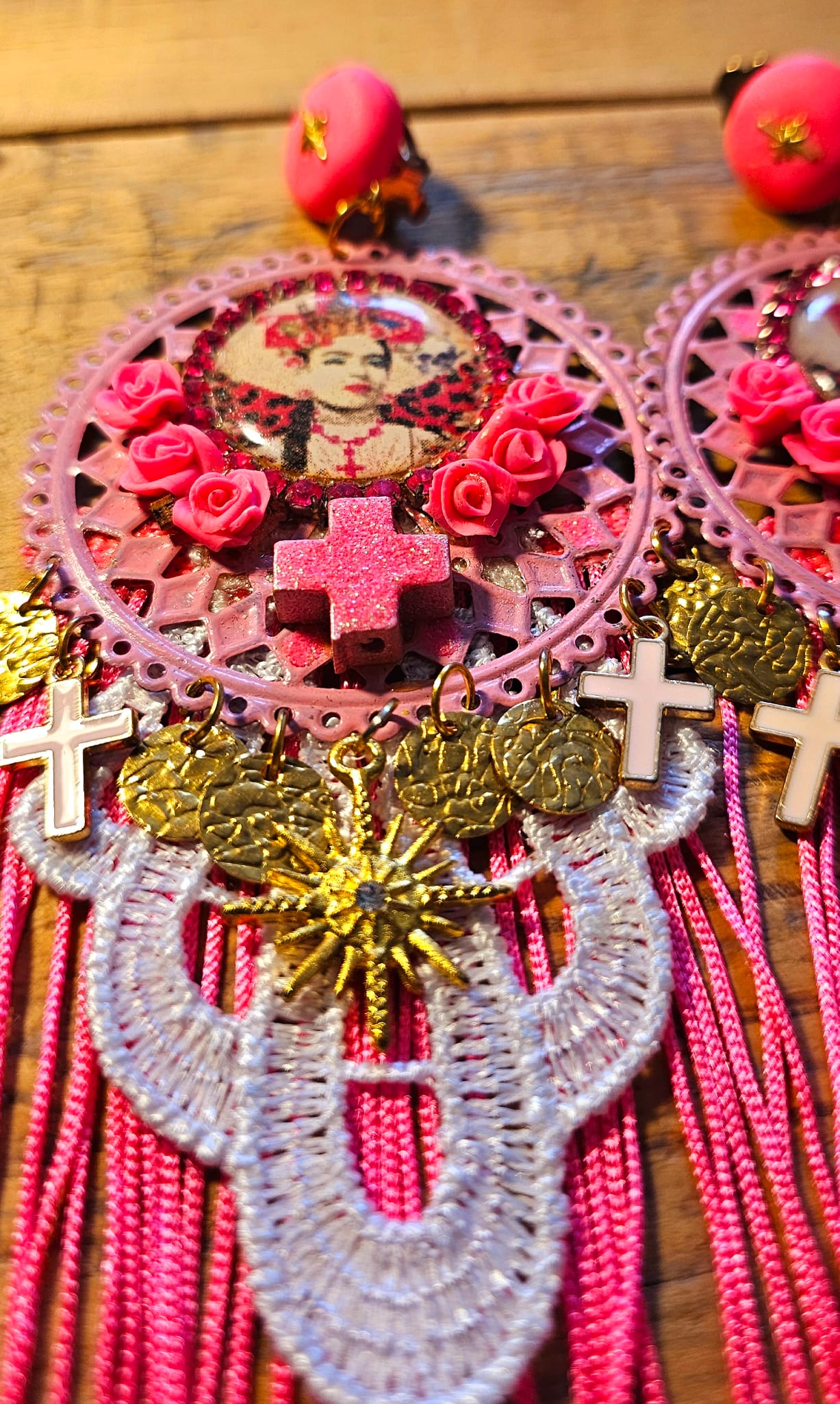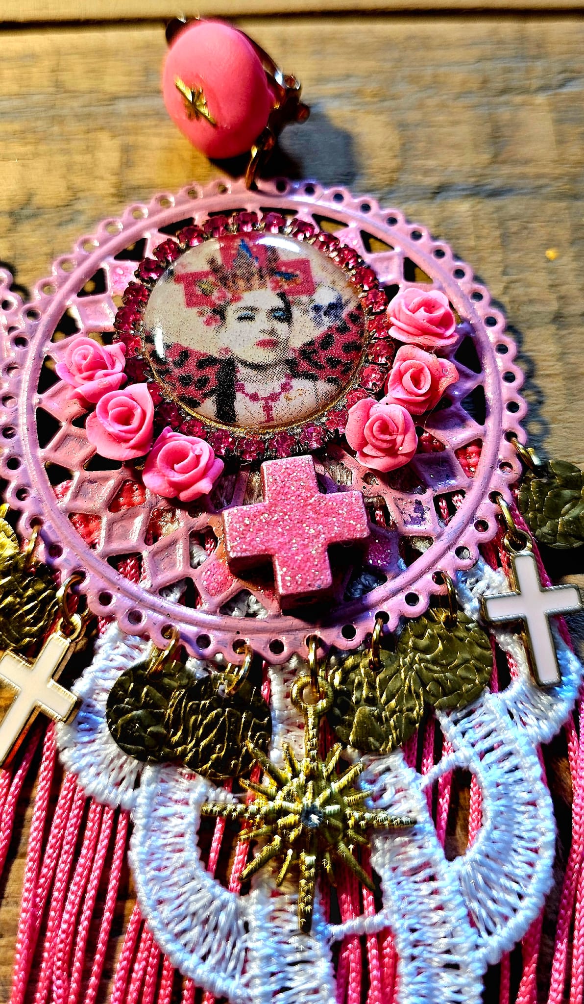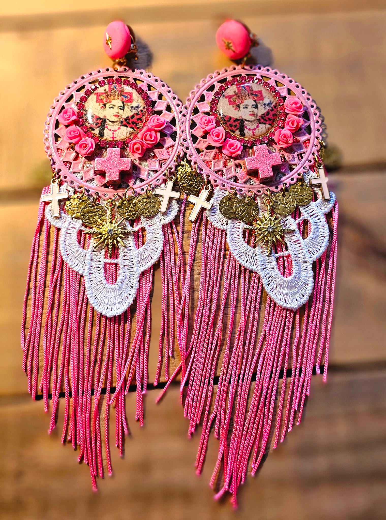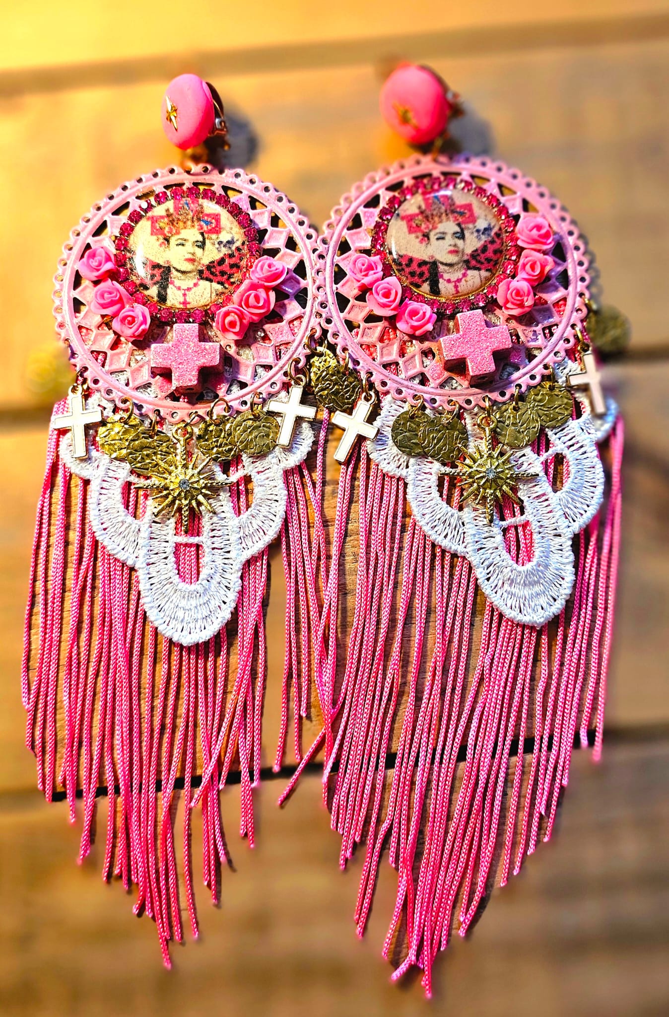 Les boucles d’oreilles Franges Roses sont une explosion de féminité et de raffinement. Leur support en métal patiné et peint à la main dans une douce teinte rose sublime une croix en bois, minutieusement peinte et pailletée en rose fluo pour un éclat vibrant. De longues franges en soie rose et une dentelle blanche délicate apportent une touche aérienne et romantique, tandis que des pampilles dorées ajoutent une note précieuse. Une pastille en bois ornée d’une image numérique resinée, signée Les Francines, parachève cette création unique et ultra légère, conçue en version clips d’oreilles.