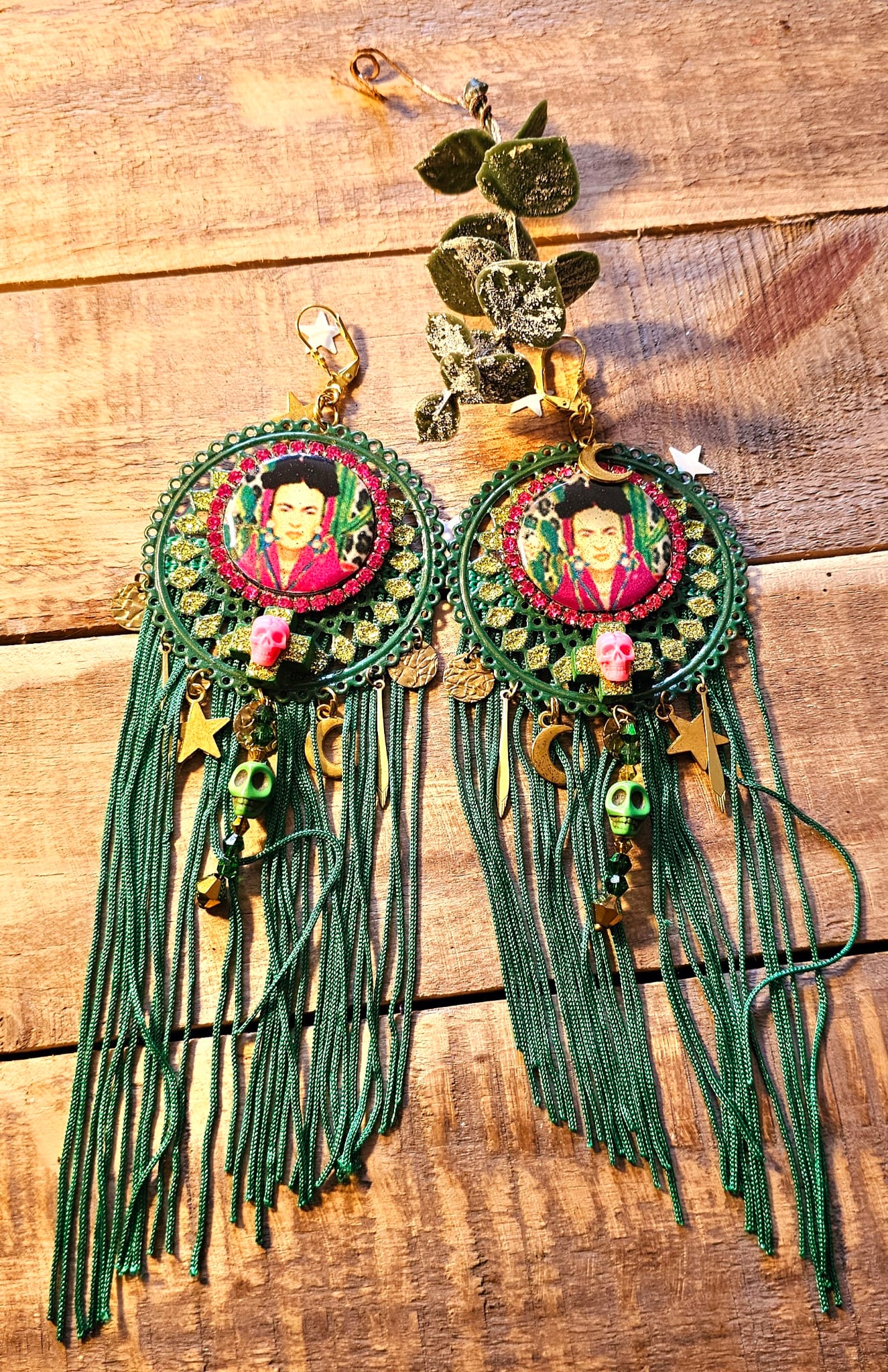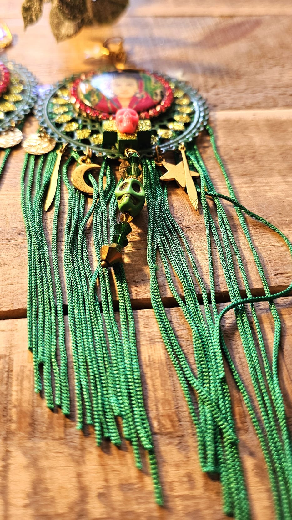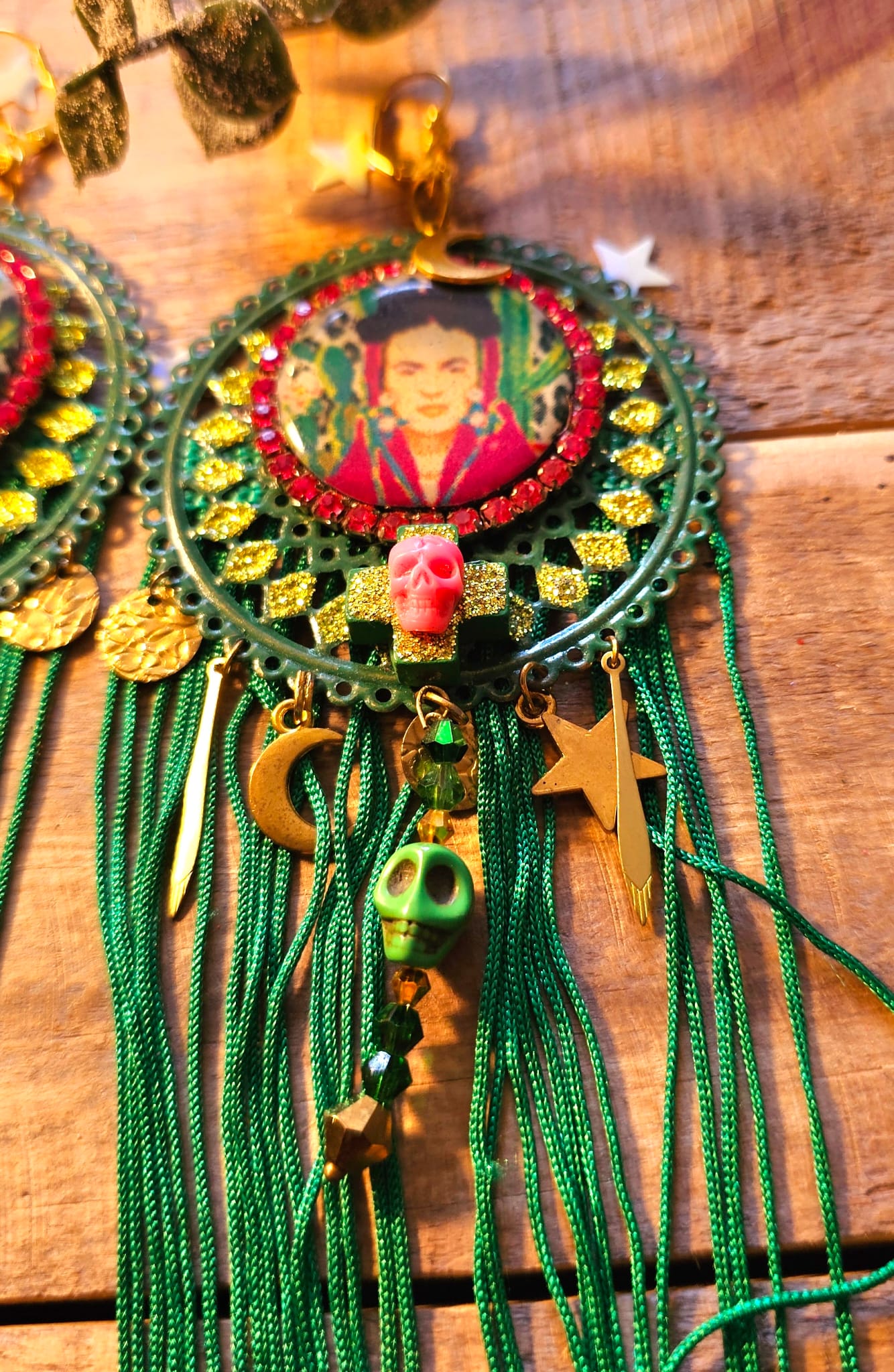 Les boucles d’oreilles I Love Frida 10 célèbrent l’audace et l’exubérance dans une création inspirée du style emblématique de Frida Kahlo. Le support en métal bronze, patiné et pailleté à la main dans une teinte verte vibrante, met en valeur deux têtes de squelette sculptées en pierre, en vert et rose. Des franges en soie verte apportent une fluidité aérienne, tandis que des strass en cristal rose fuchsia et des pampilles dorées ajoutent une touche d’éclat. Une pastille en bois ornée d’une image numérique resinée Frida Kahlo Vierge, signée Les Francines, parachève cette création unique et ultra légère.