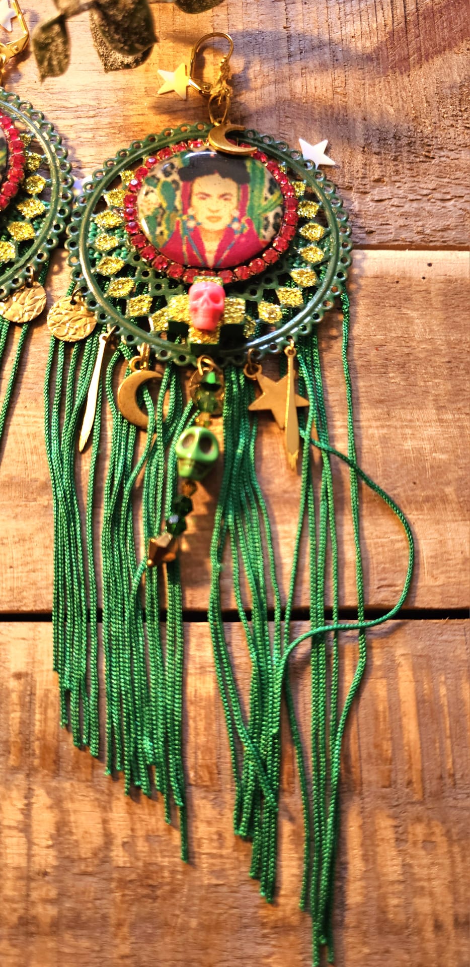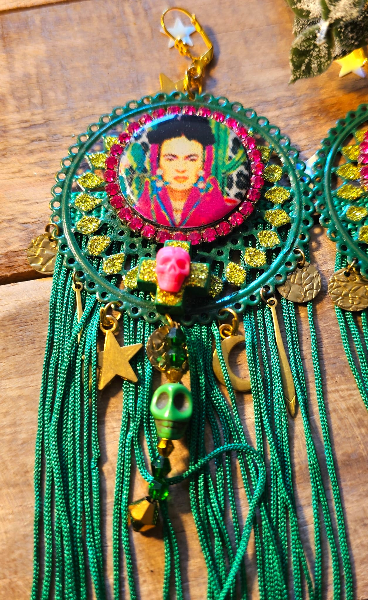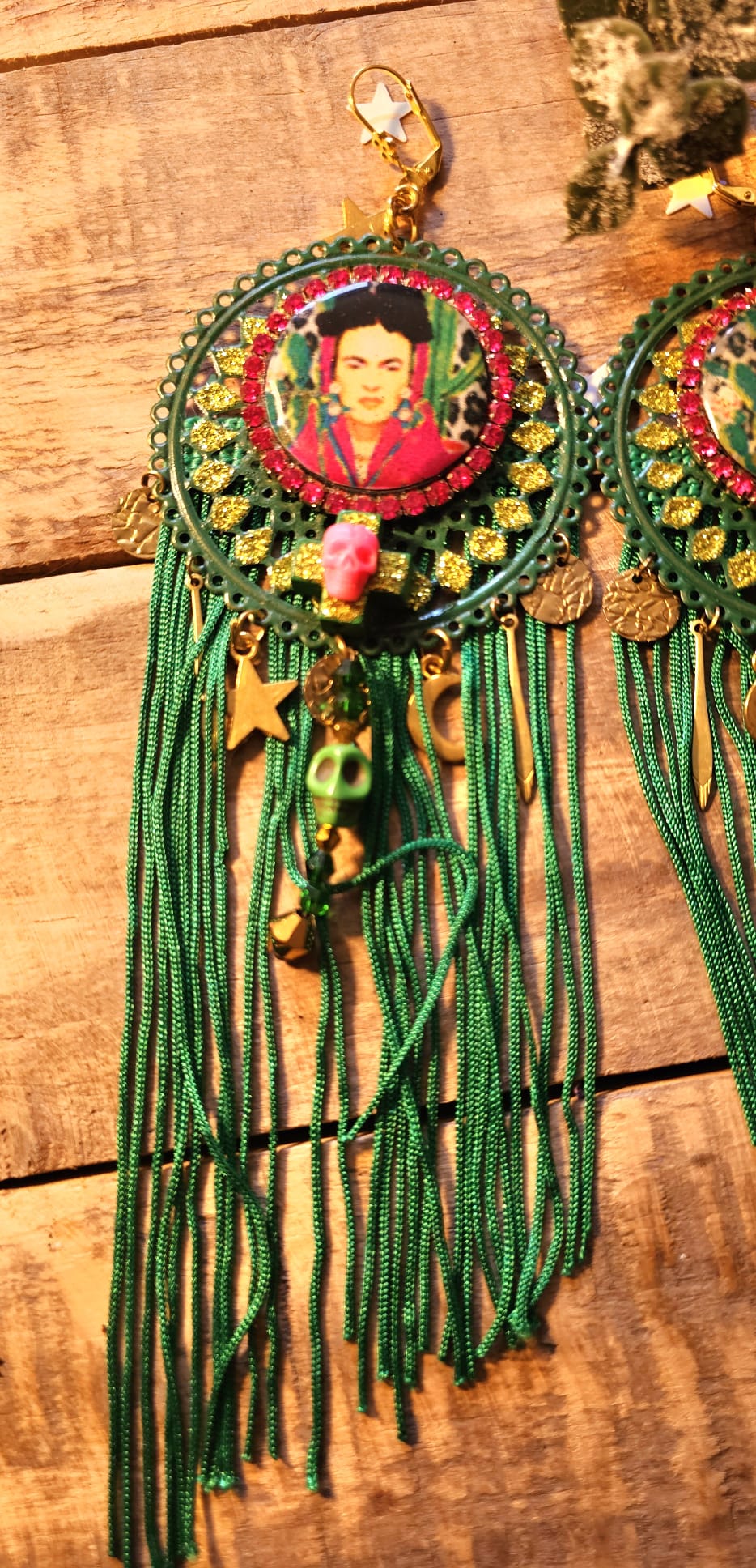 Les boucles d’oreilles I Love Frida 10 célèbrent l’audace et l’exubérance dans une création inspirée du style emblématique de Frida Kahlo. Le support en métal bronze, patiné et pailleté à la main dans une teinte verte vibrante, met en valeur deux têtes de squelette sculptées en pierre, en vert et rose. Des franges en soie verte apportent une fluidité aérienne, tandis que des strass en cristal rose fuchsia et des pampilles dorées ajoutent une touche d’éclat. Une pastille en bois ornée d’une image numérique resinée Frida Kahlo Vierge, signée Les Francines, parachève cette création unique et ultra légère.