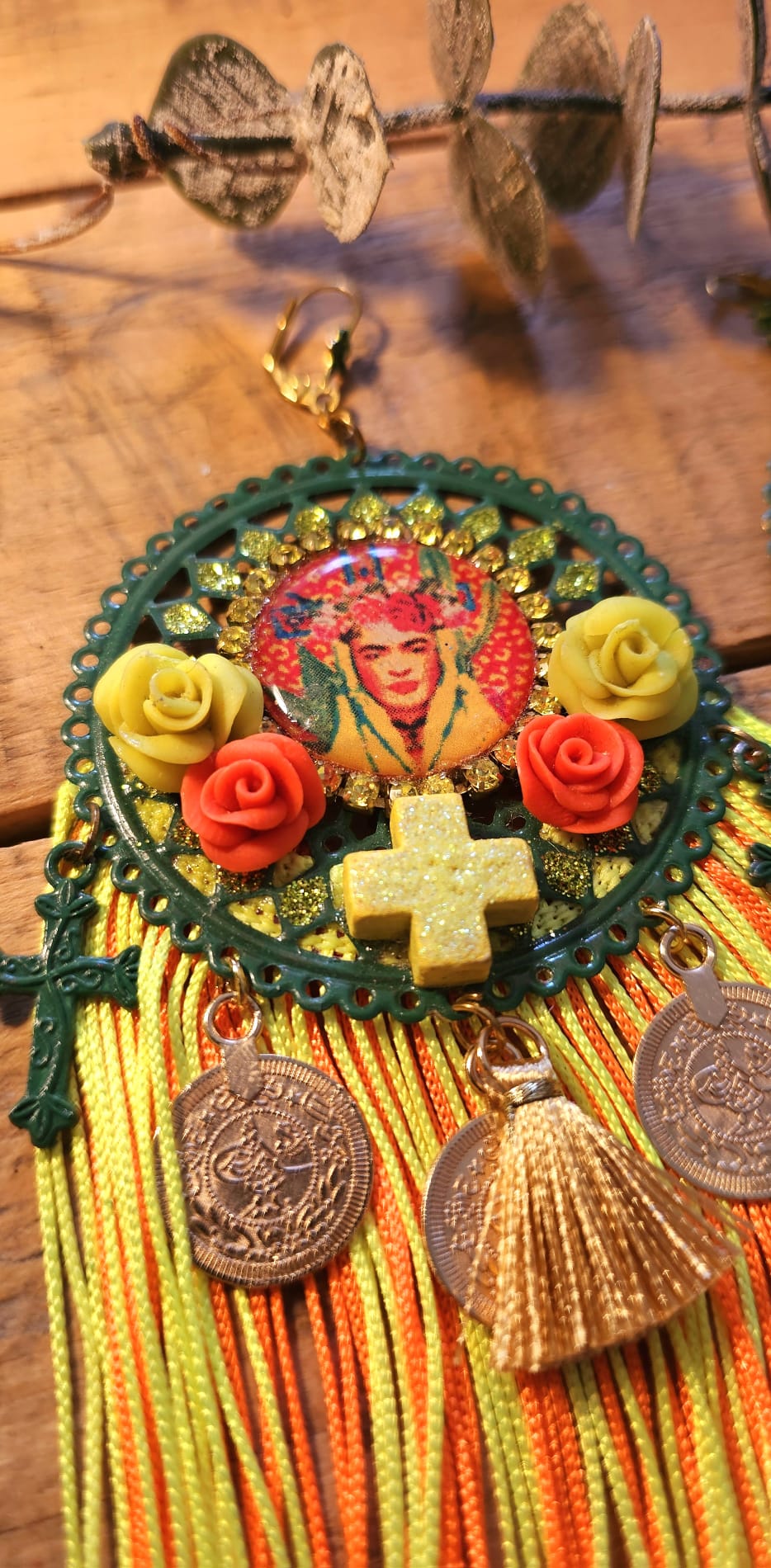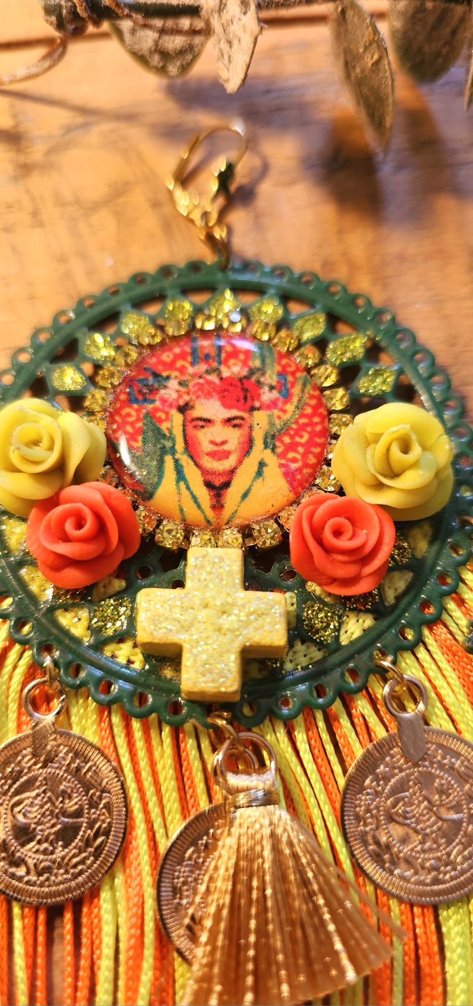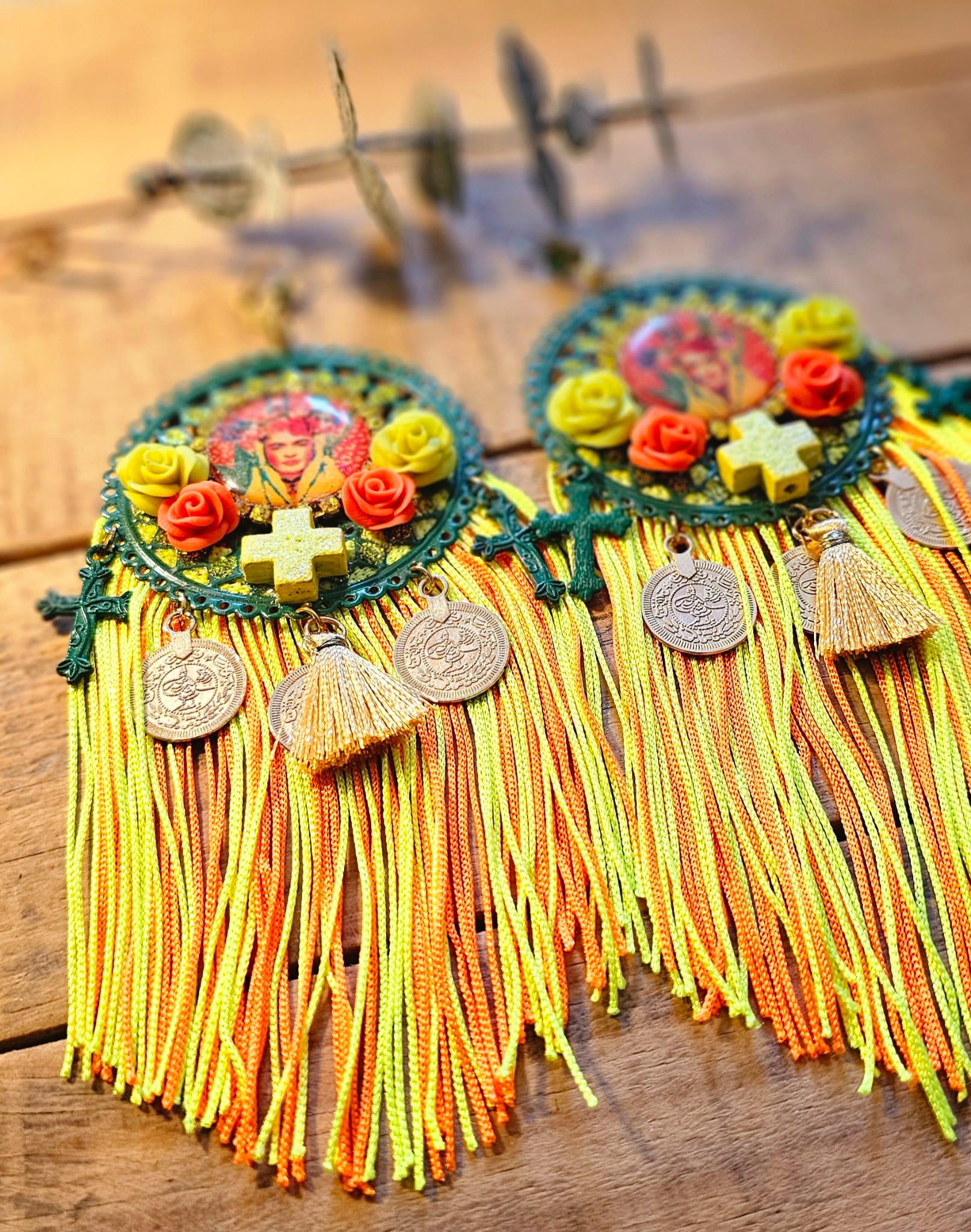 Les boucles d’oreilles I Love Frida 11 sont une célébration vibrante du style audacieux et coloré de Frida Kahlo. Leur support en métal patiné et peint à la main dans un vert profond sublime une croix assortie, minutieusement travaillée. Des roses sculptées en pâte polymère, dans des nuances éclatantes de jaune et d’orange fluo, viennent illuminer la création. De longues franges en soie, mêlant orange vif et jaune fluo, apportent un mouvement fluide et envoûtant. Une pastille en bois ornée d’une image numérique resinée, signée Les Francines, parachève cette pièce unique et ultra légère.