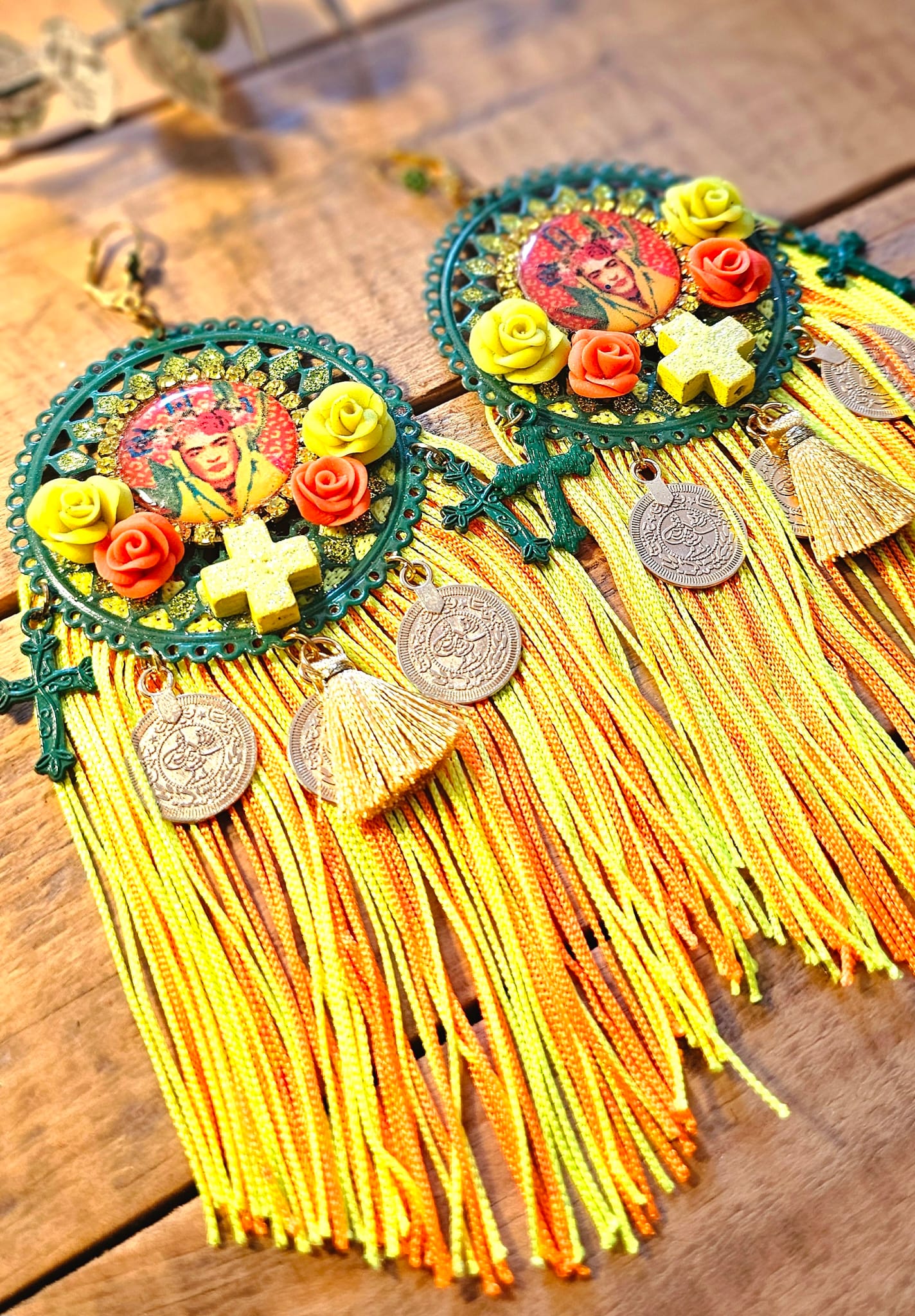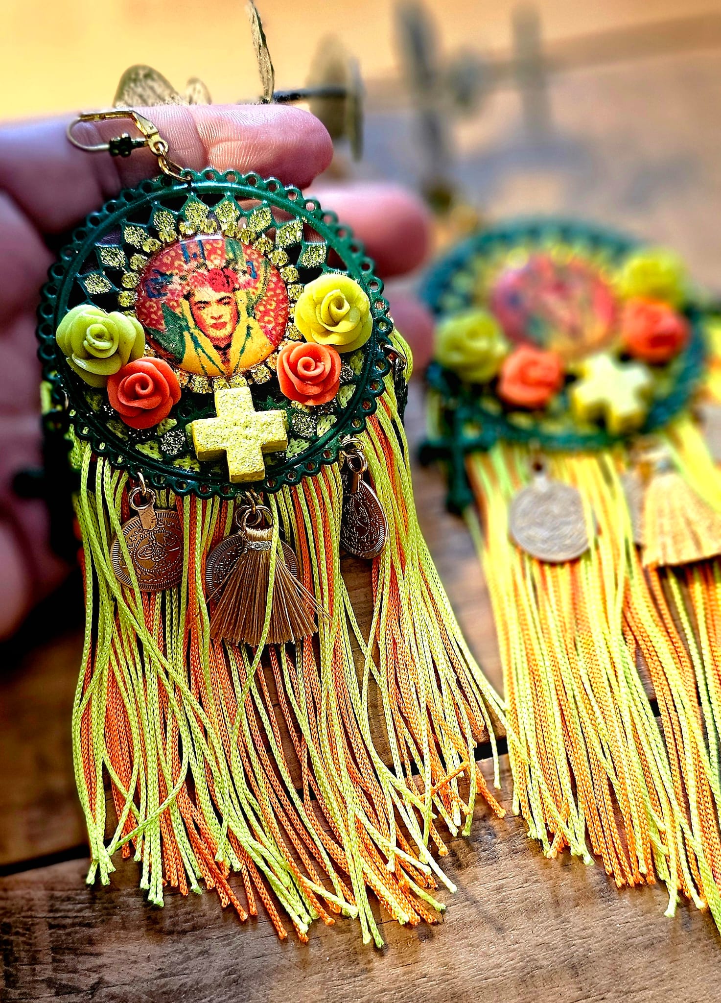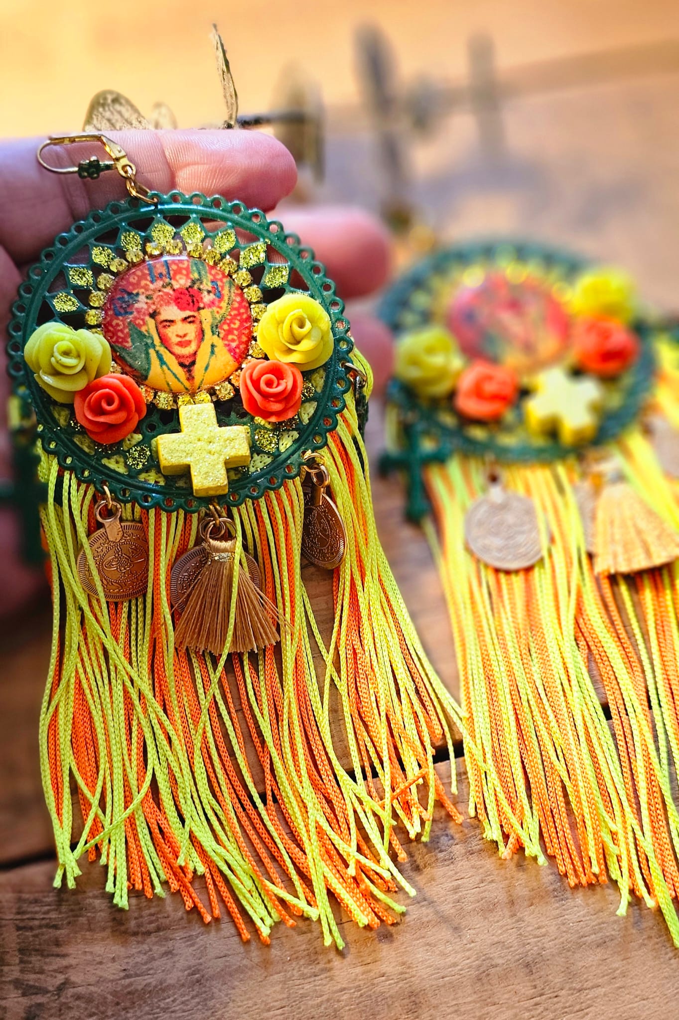 Les boucles d’oreilles I Love Frida 11 sont une célébration vibrante du style audacieux et coloré de Frida Kahlo. Leur support en métal patiné et peint à la main dans un vert profond sublime une croix assortie, minutieusement travaillée. Des roses sculptées en pâte polymère, dans des nuances éclatantes de jaune et d’orange fluo, viennent illuminer la création. De longues franges en soie, mêlant orange vif et jaune fluo, apportent un mouvement fluide et envoûtant. Une pastille en bois ornée d’une image numérique resinée, signée Les Francines, parachève cette pièce unique et ultra légère.