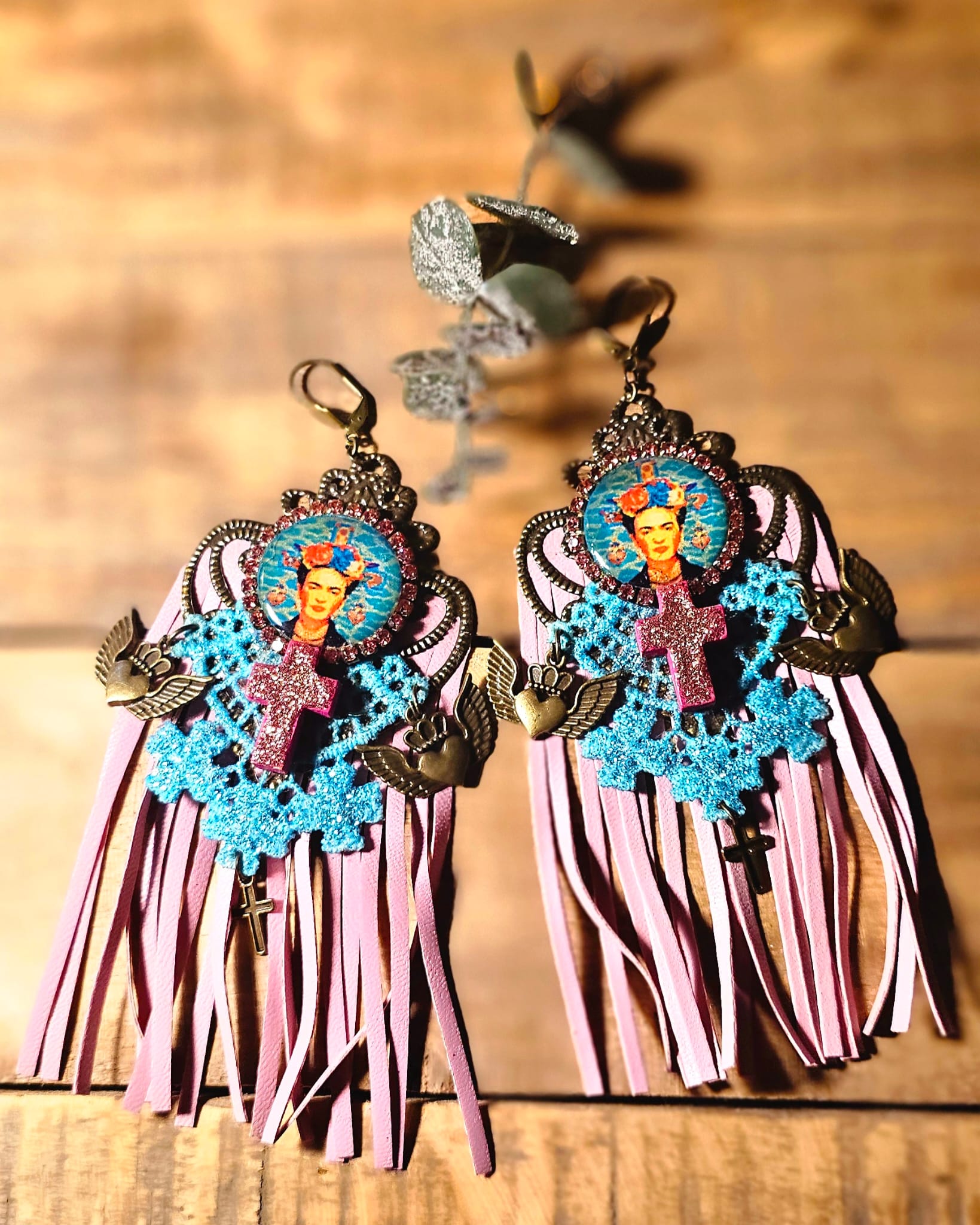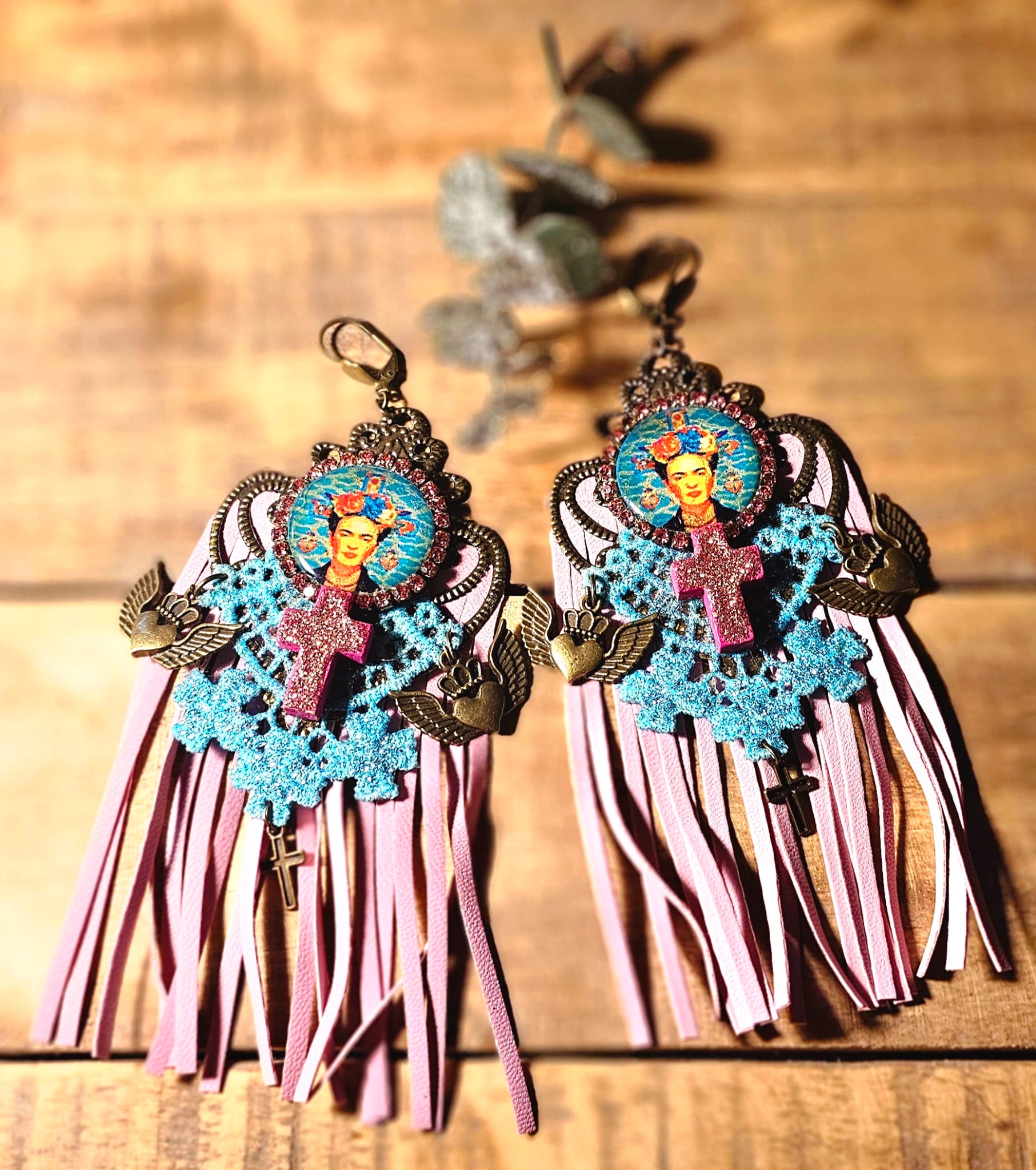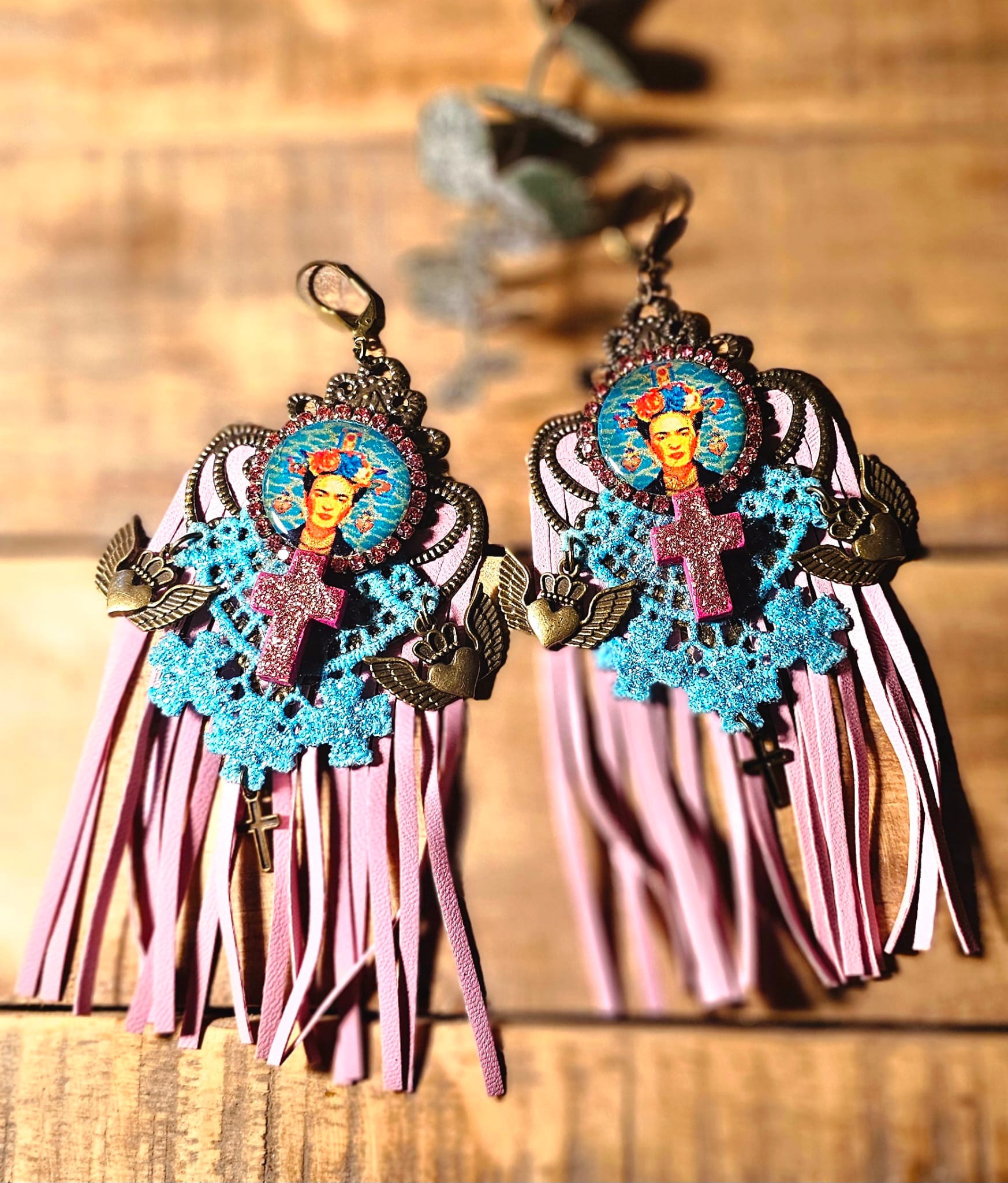 Affirmez votre style avec ces boucles d’oreilles uniques, inspirées par l’univers flamboyant de Frida Kahlo. Un support en métal bronze accueille une croix en bois, peinte et pailletée à la main pour un éclat subtil. Les franges en cuir rose et les dentelles turquoise, elles aussi minutieusement peintes et pailletées, apportent une touche de romantisme audacieux. Une pastille en bois, ornée d’une image numérique resinée signée Les Francines, parachève cette création artisanale, légère et empreinte de poésie.