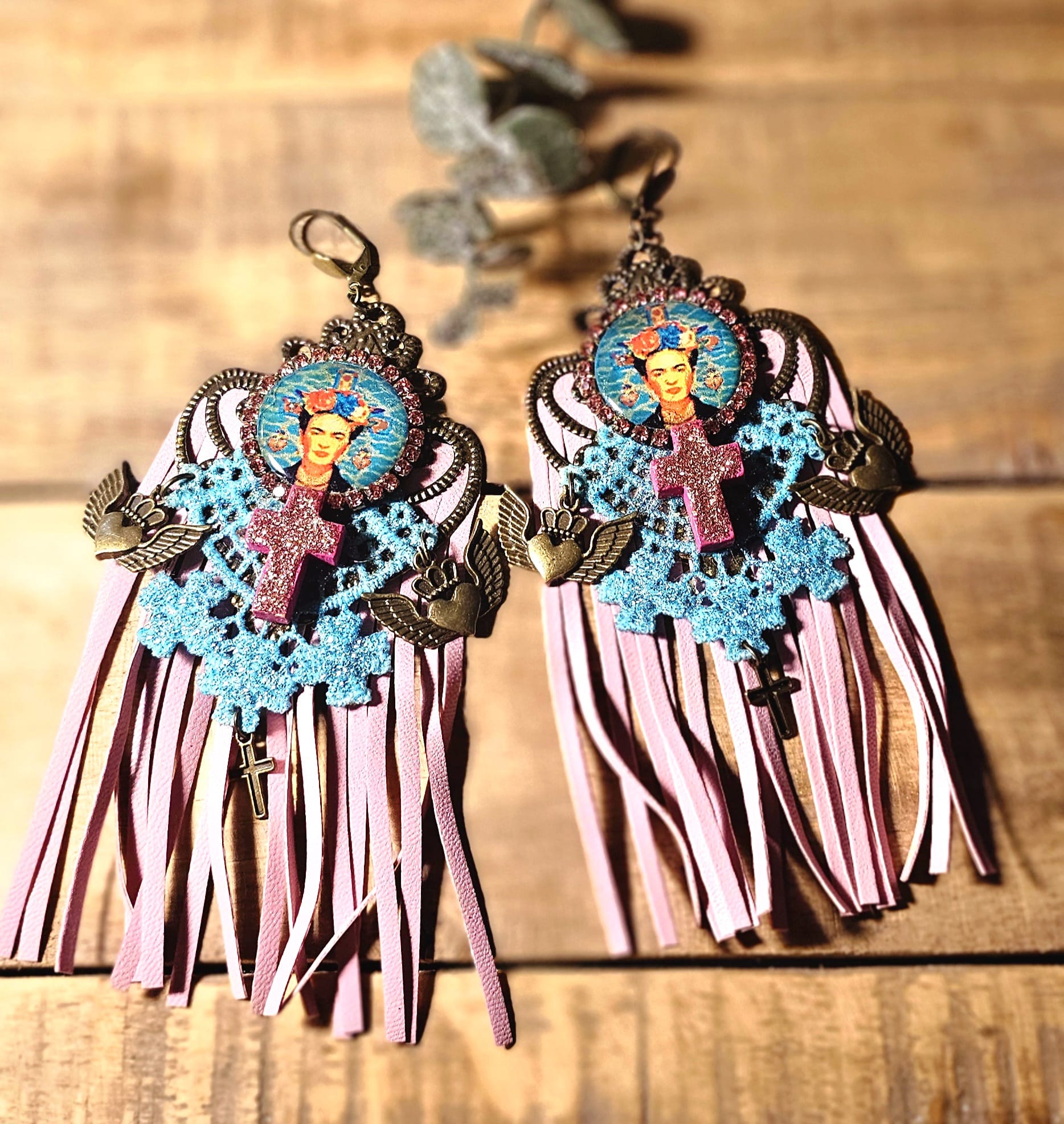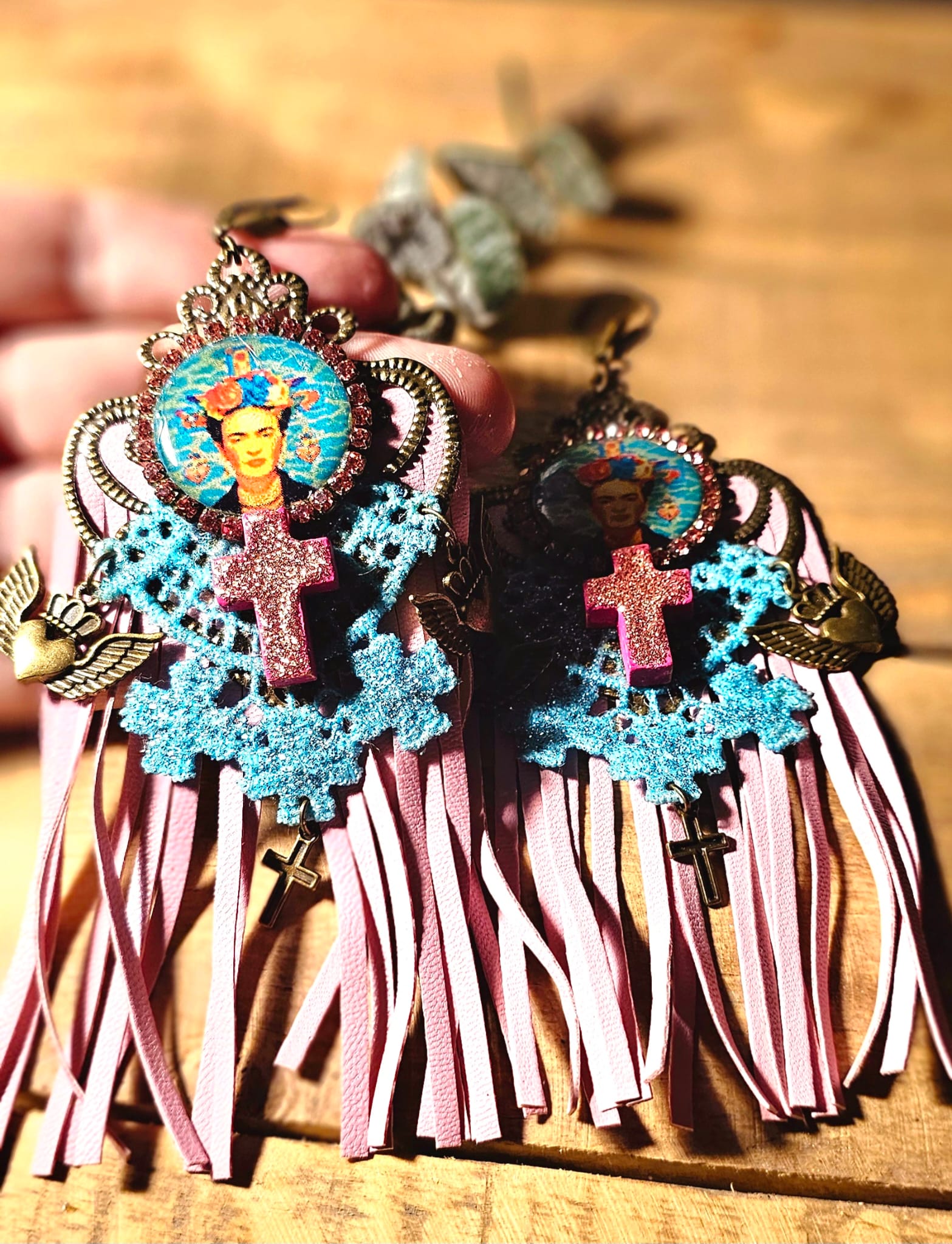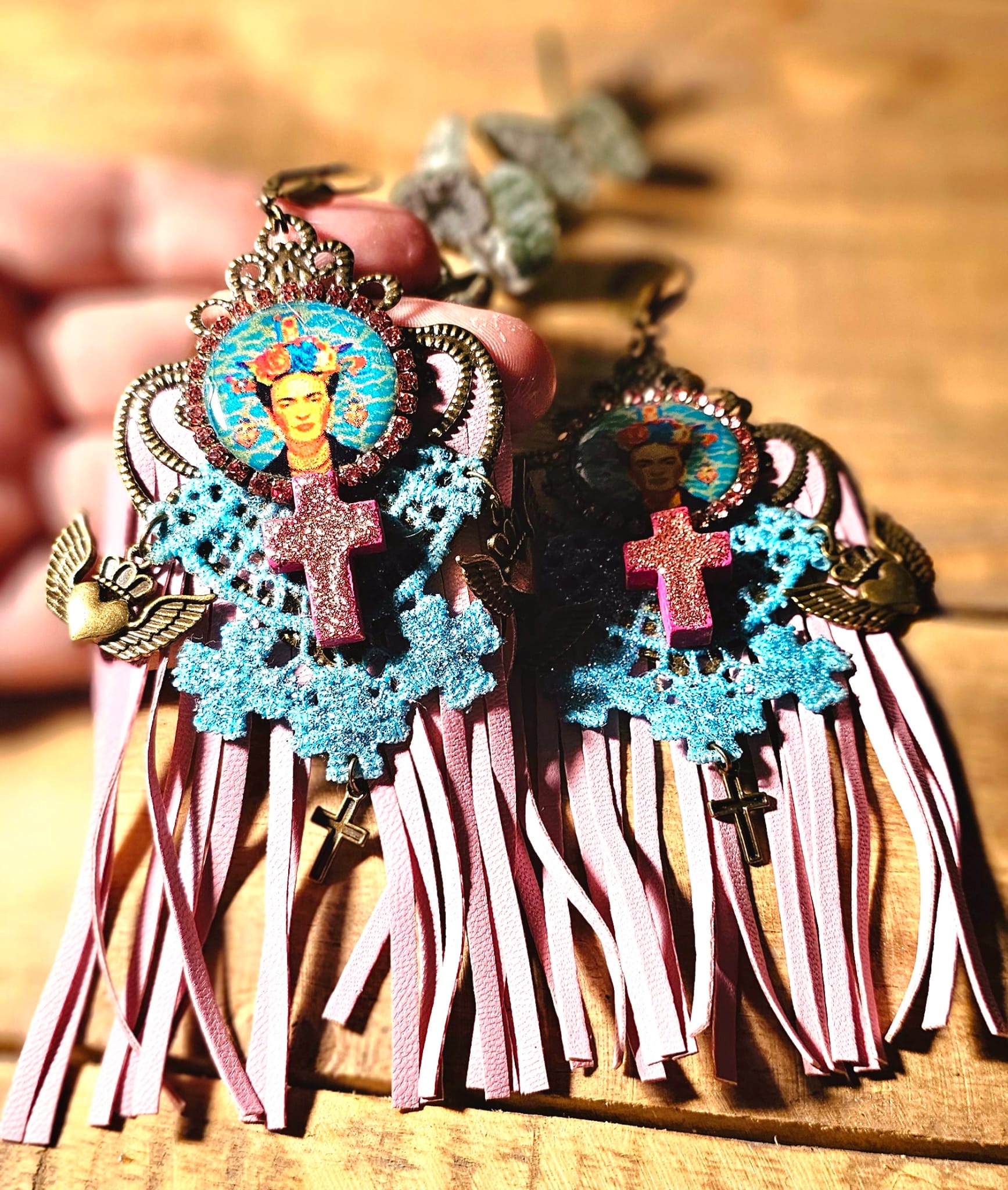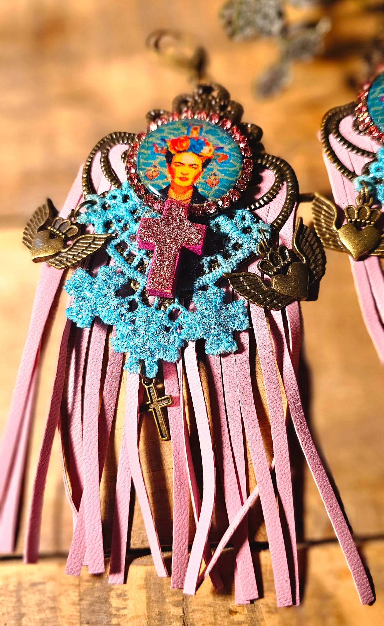 Affirmez votre style avec ces boucles d’oreilles uniques, inspirées par l’univers flamboyant de Frida Kahlo. Un support en métal bronze accueille une croix en bois, peinte et pailletée à la main pour un éclat subtil. Les franges en cuir rose et les dentelles turquoise, elles aussi minutieusement peintes et pailletées, apportent une touche de romantisme audacieux. Une pastille en bois, ornée d’une image numérique resinée signée Les Francines, parachève cette création artisanale, légère et empreinte de poésie.
