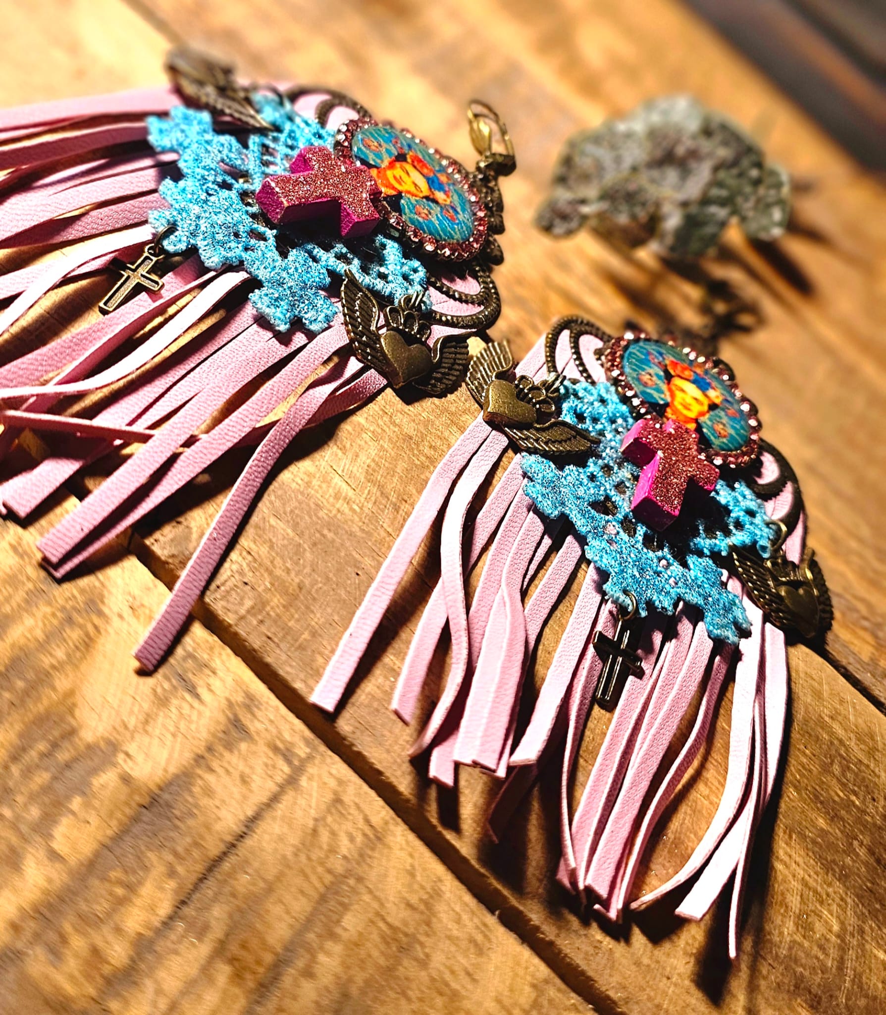 Les franges en cuir rose ajoutent une fluidité élégante et un mouvement subtil, tandis que les dentelles turquoise, elles aussi peintes et pailletées à la main, insufflent une note de raffinement bohème. Une pastille en bois, sublimée par une image numérique resinée et signée Les Francines, vient parfaire cet ensemble artistique et exclusif. À la fois légères et majestueuses, ces boucles d’oreilles sont l’accessoire parfait pour illuminer une tenue avec originalité et élégance.