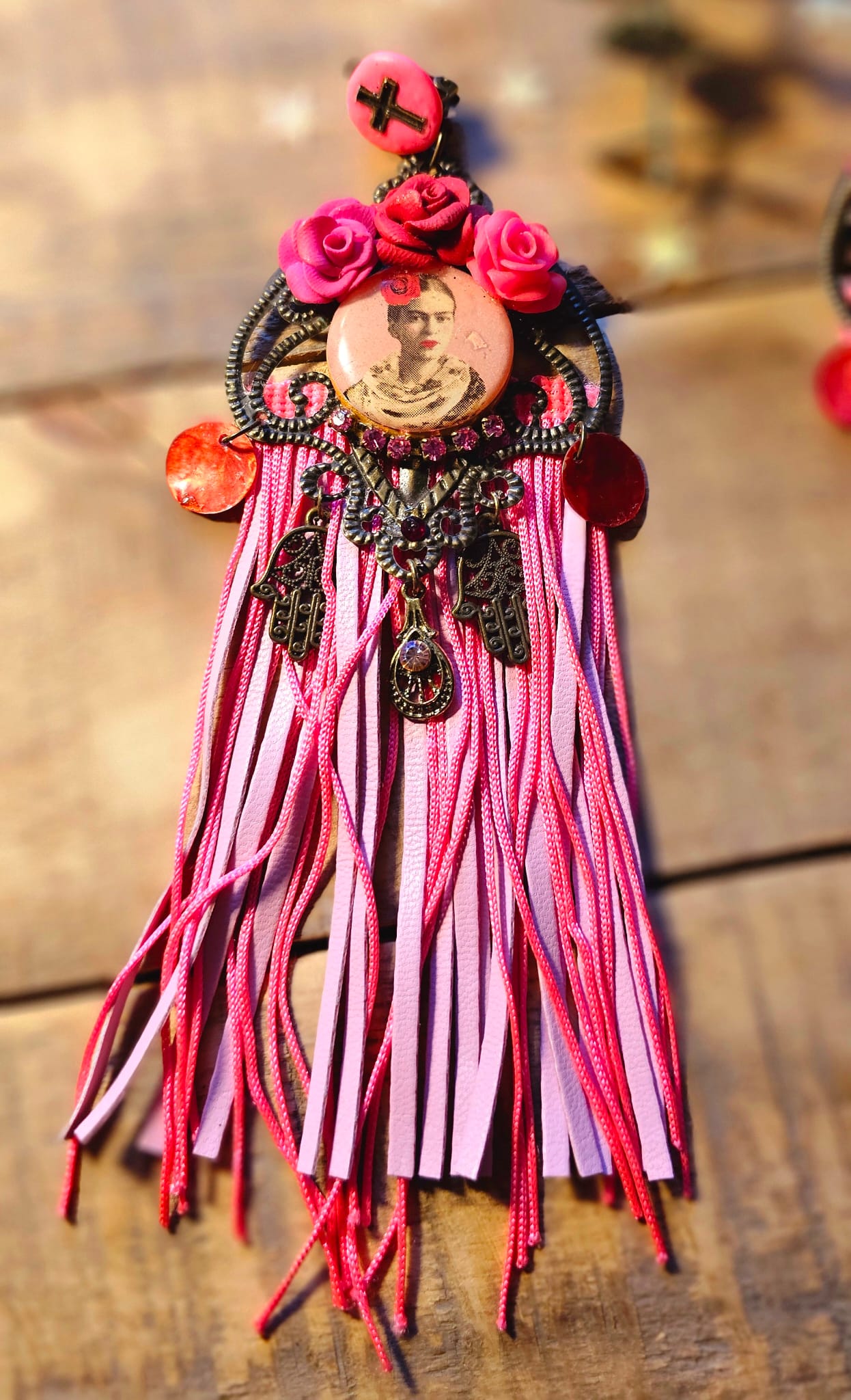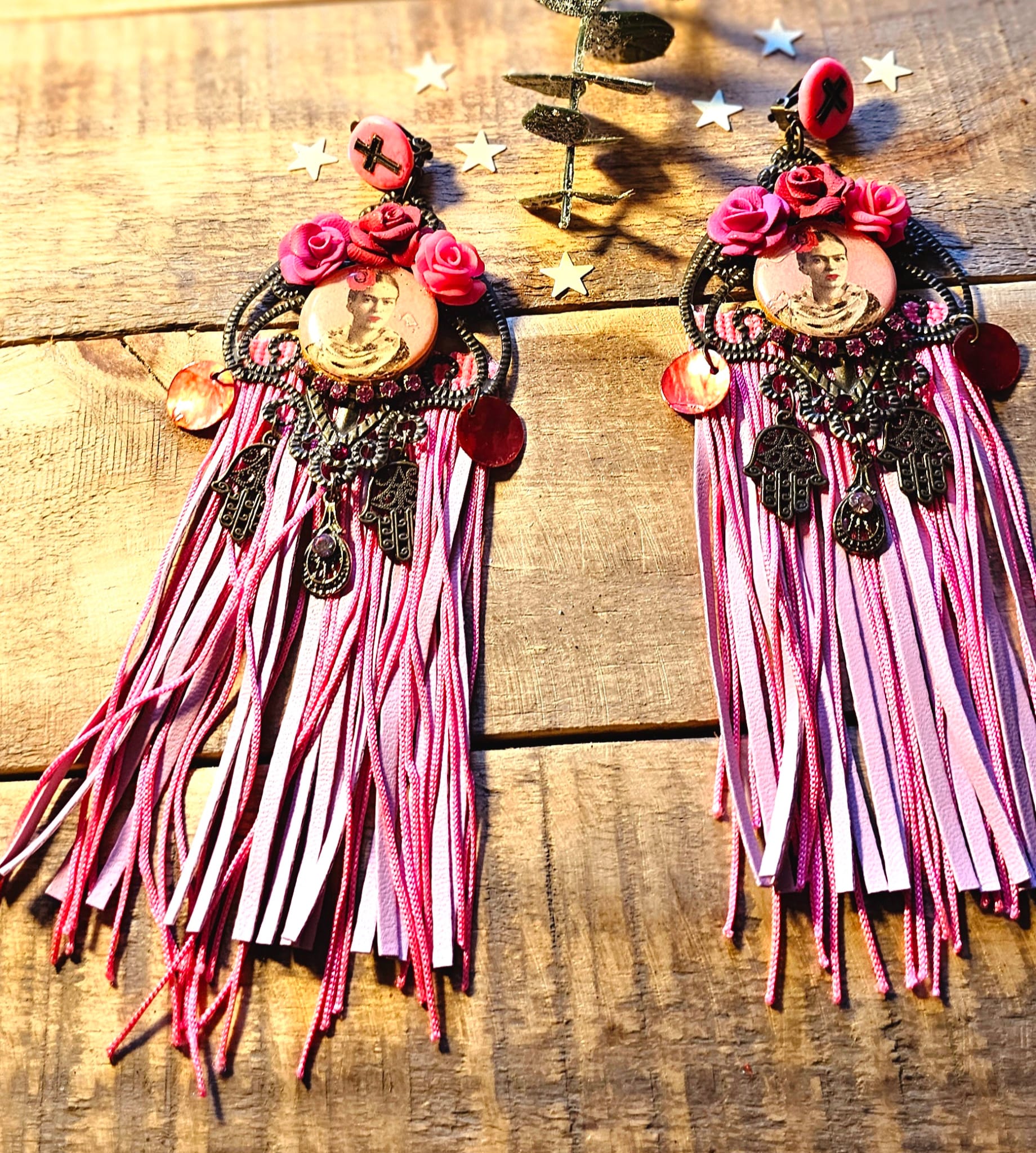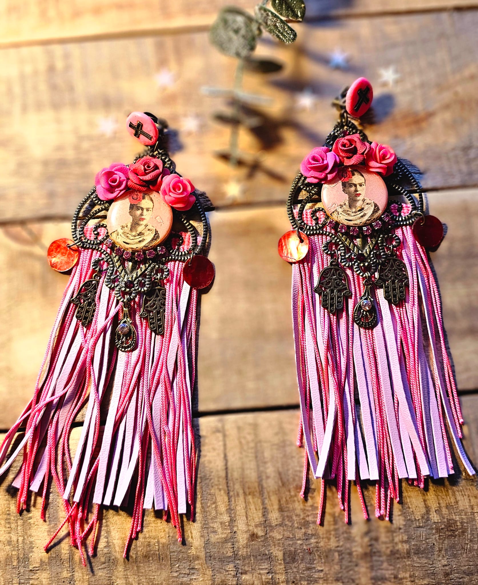 Les boucles d’oreilles I Love Frida 4 célèbrent la féminité et l’artisanat à travers une création envoûtante. Leur support en métal bronze accueille de délicates roses sculptées à la main en argile polymère, mêlant nuances de rose et de rouge. Des franges en cuir et en soie rose apportent une fluidité aérienne, sublimant chaque mouvement. Une pastille en bois, ornée d’une image numérique resinée signée Les Francines, parachève cette pièce unique et ultra légère, pensée pour magnifier votre style avec poésie et raffinement.