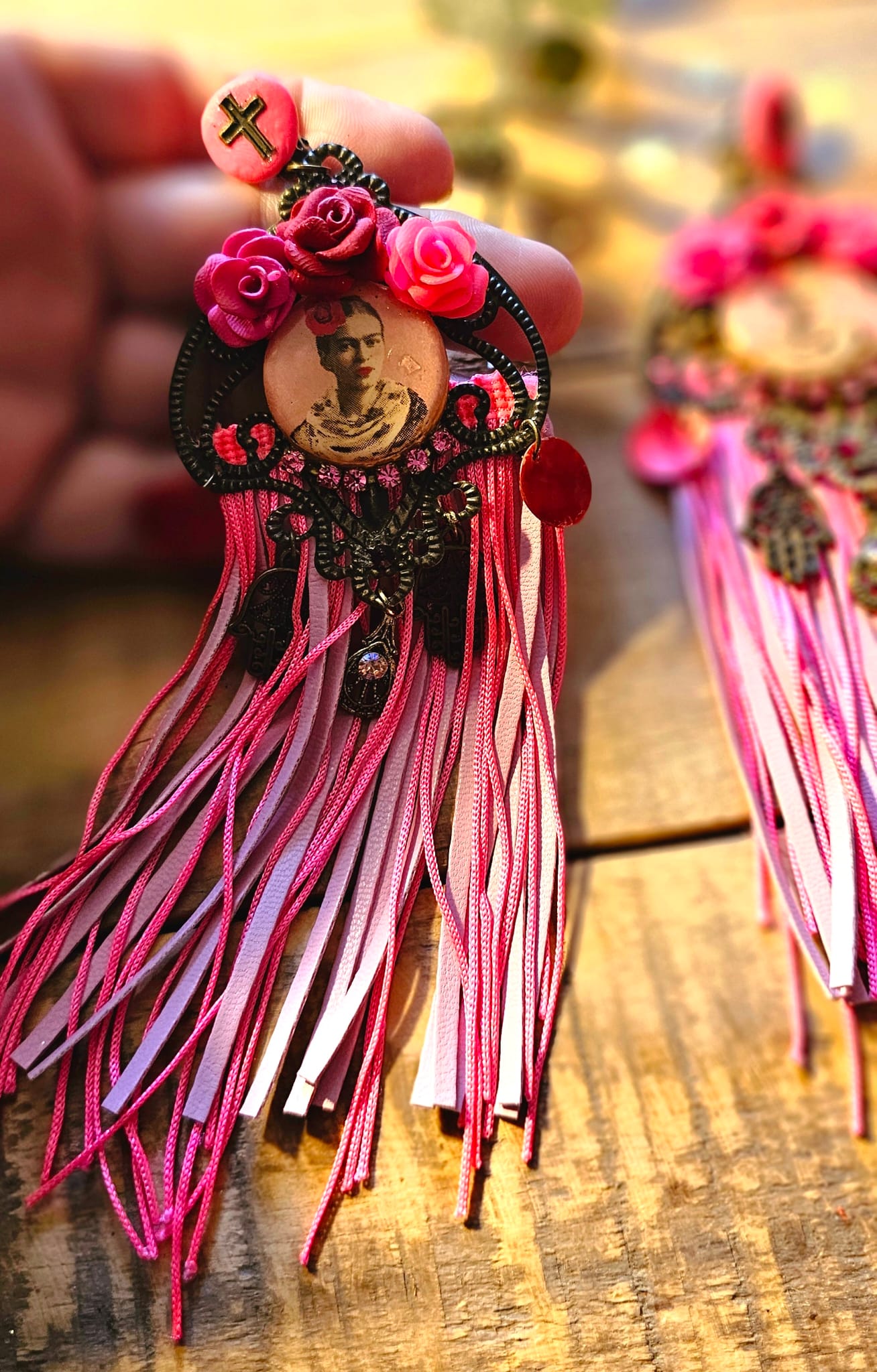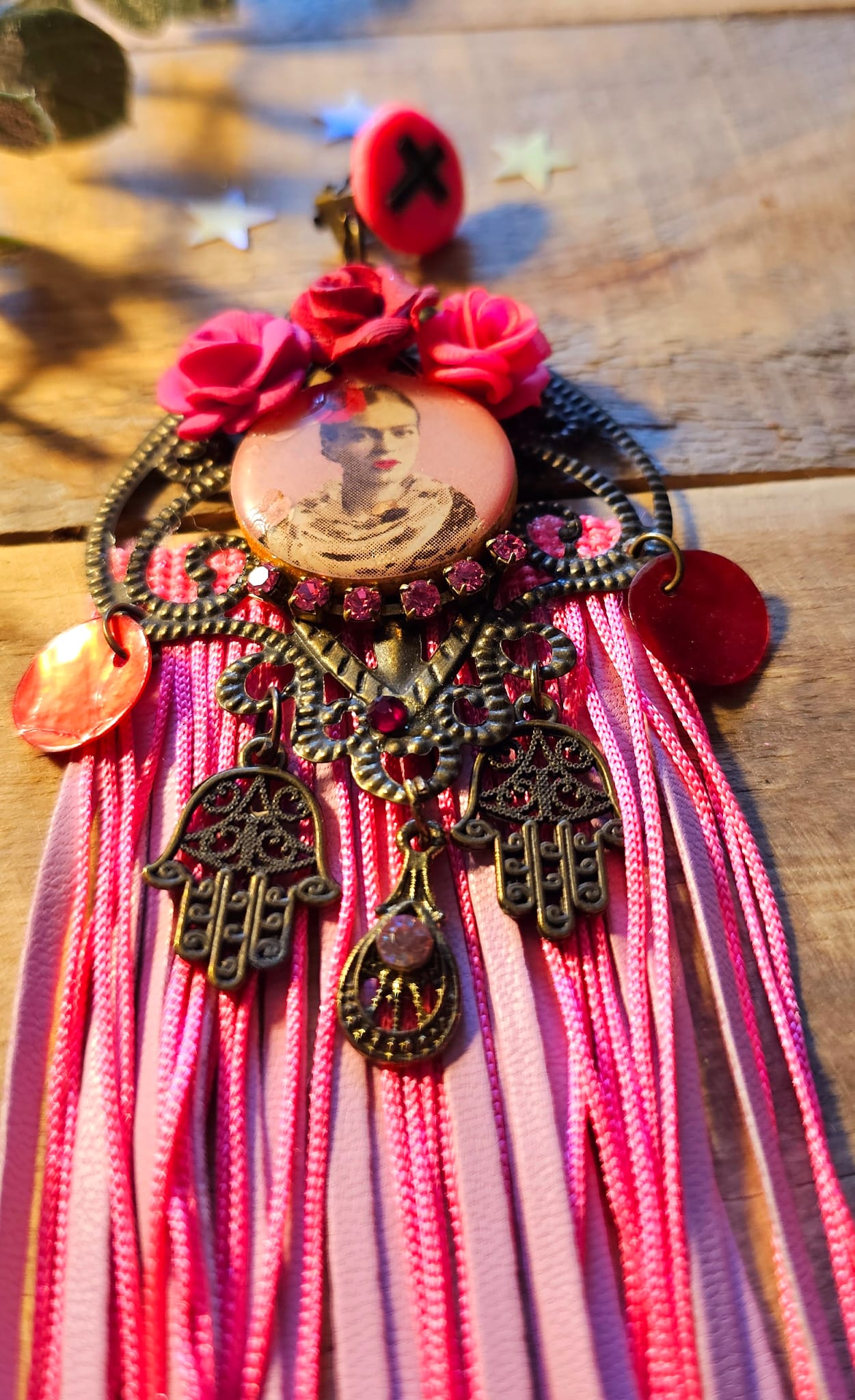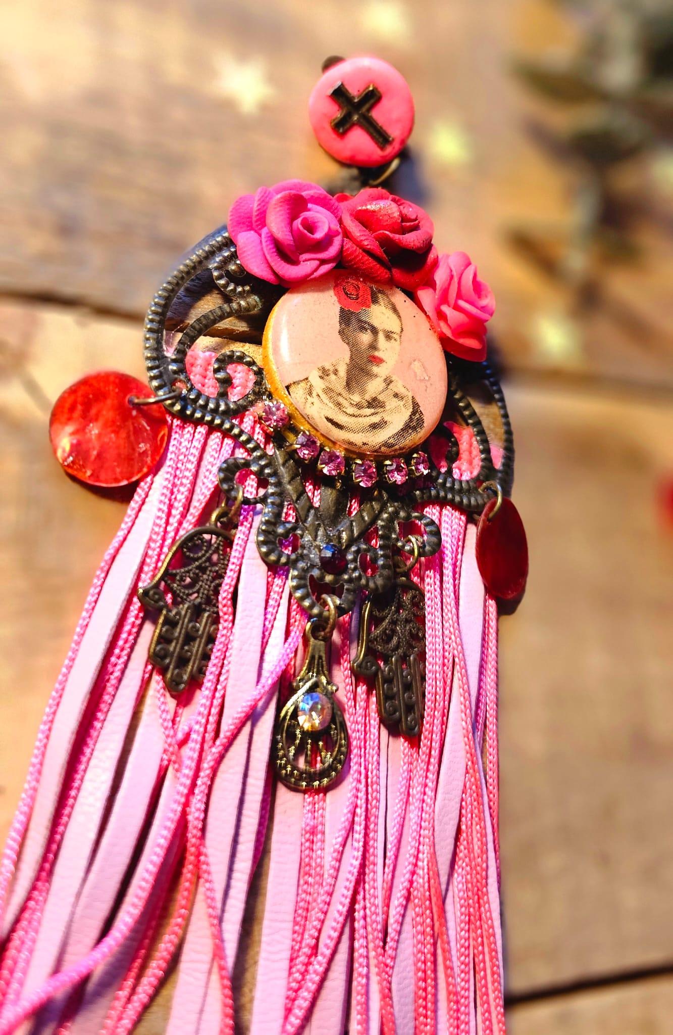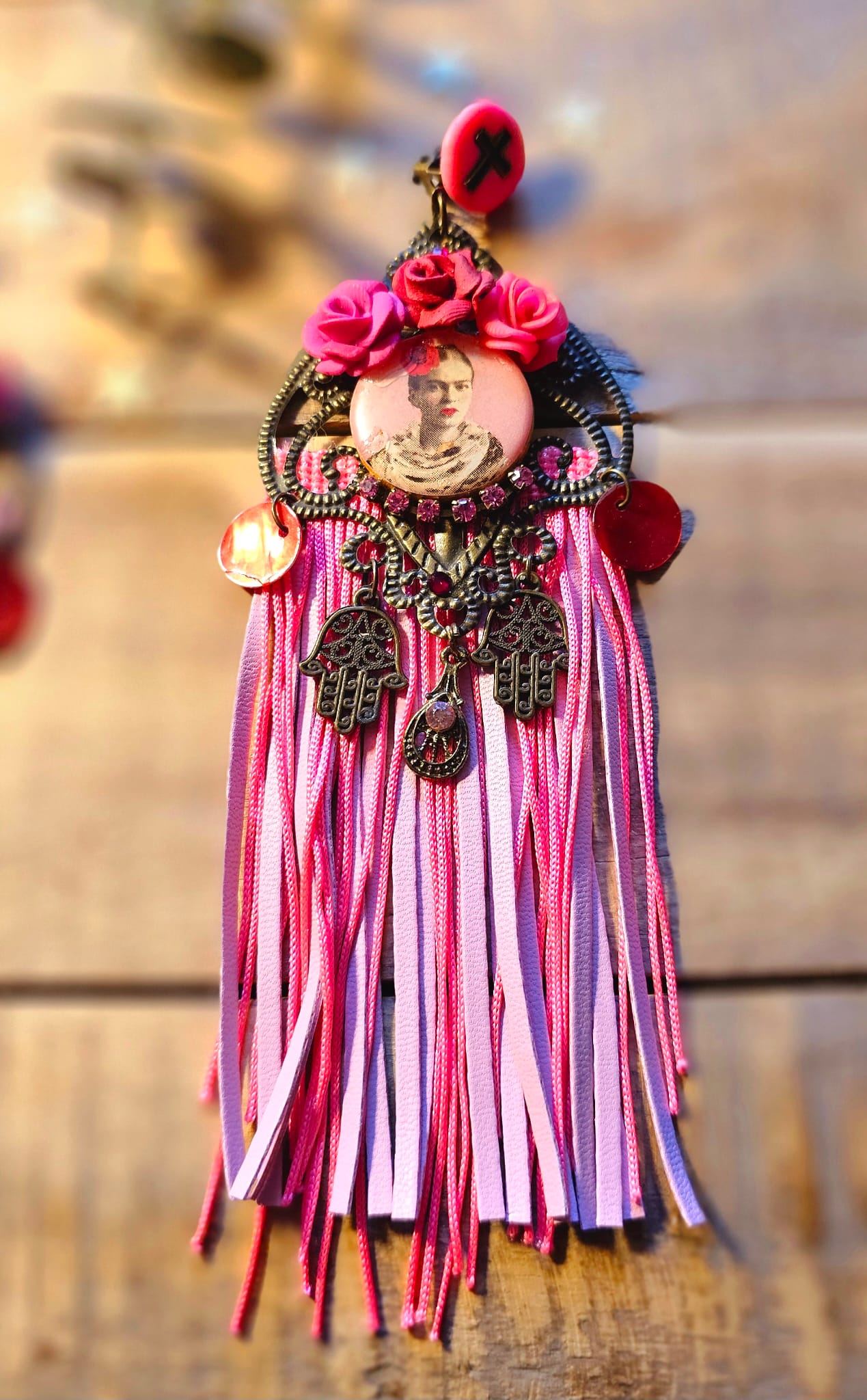 Les boucles d’oreilles I Love Frida 4 célèbrent la féminité et l’artisanat à travers une création envoûtante. Leur support en métal bronze accueille de délicates roses sculptées à la main en argile polymère, mêlant nuances de rose et de rouge. Des franges en cuir et en soie rose apportent une fluidité aérienne, sublimant chaque mouvement. Une pastille en bois, ornée d’une image numérique resinée signée Les Francines, parachève cette pièce unique et ultra légère, pensée pour magnifier votre style avec poésie et raffinement.