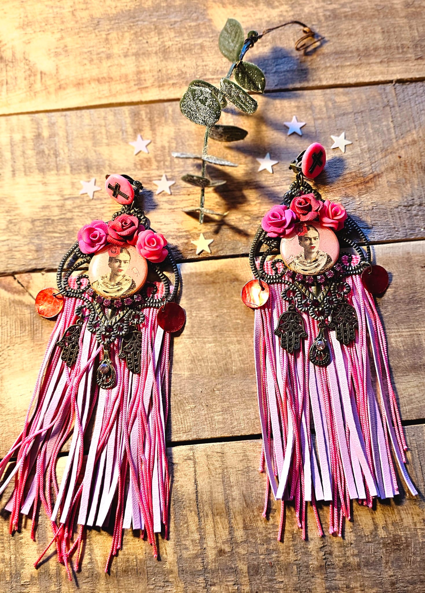 Inspirées par l’univers flamboyant de Frida Kahlo, les boucles d’oreilles I Love Frida 4 sont une ode à l’art et à l’expression de soi. Entièrement façonnées à la main, elles se distinguent par un équilibre parfait entre textures, couleurs et détails minutieux. Le support en métal bronze, à la fois intemporel et authentique, met en valeur des roses sculptées à la main en argile polymère, alternant entre des nuances vibrantes de rose et de rouge pour une esthétique romantique et puissante.
