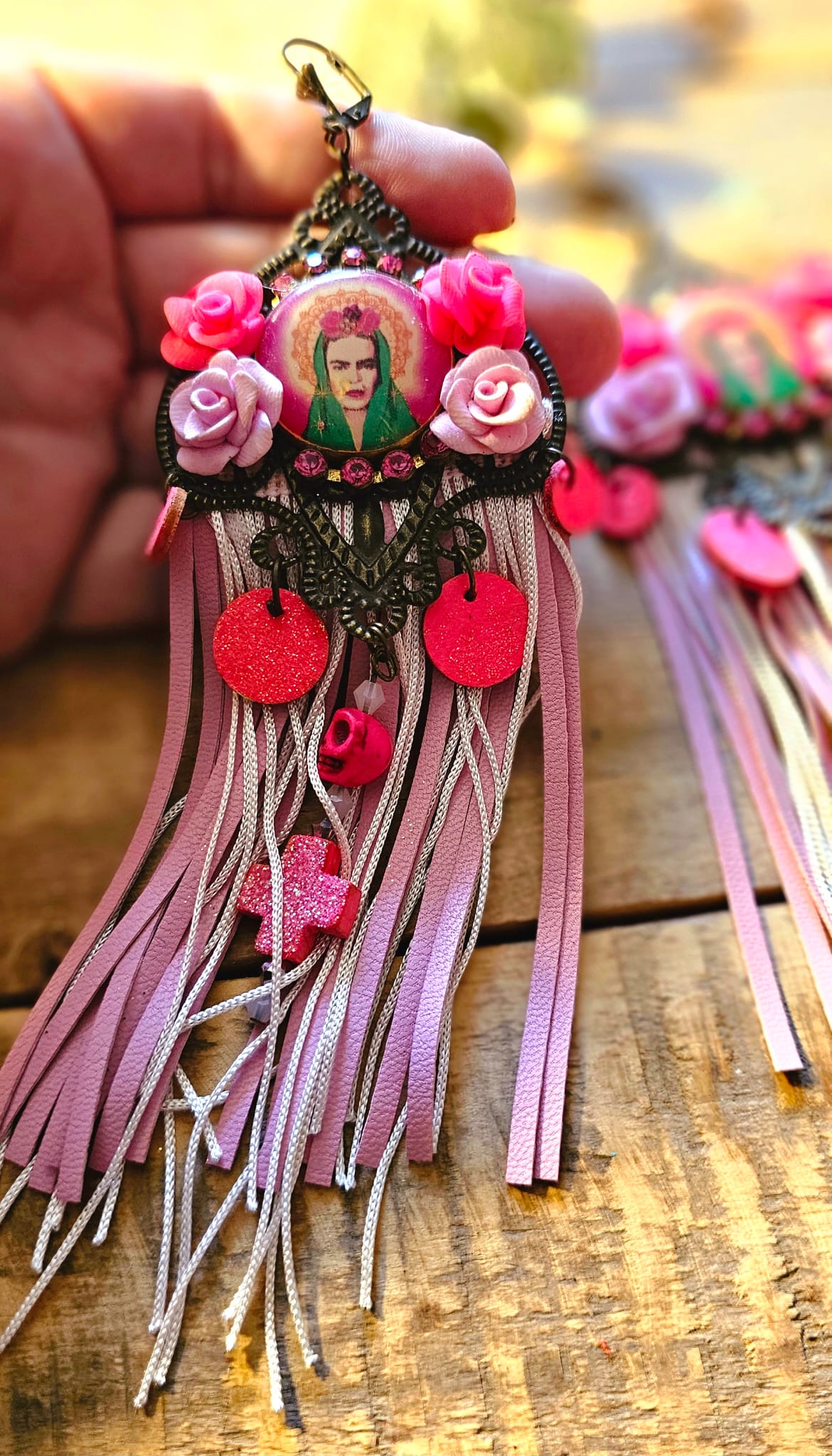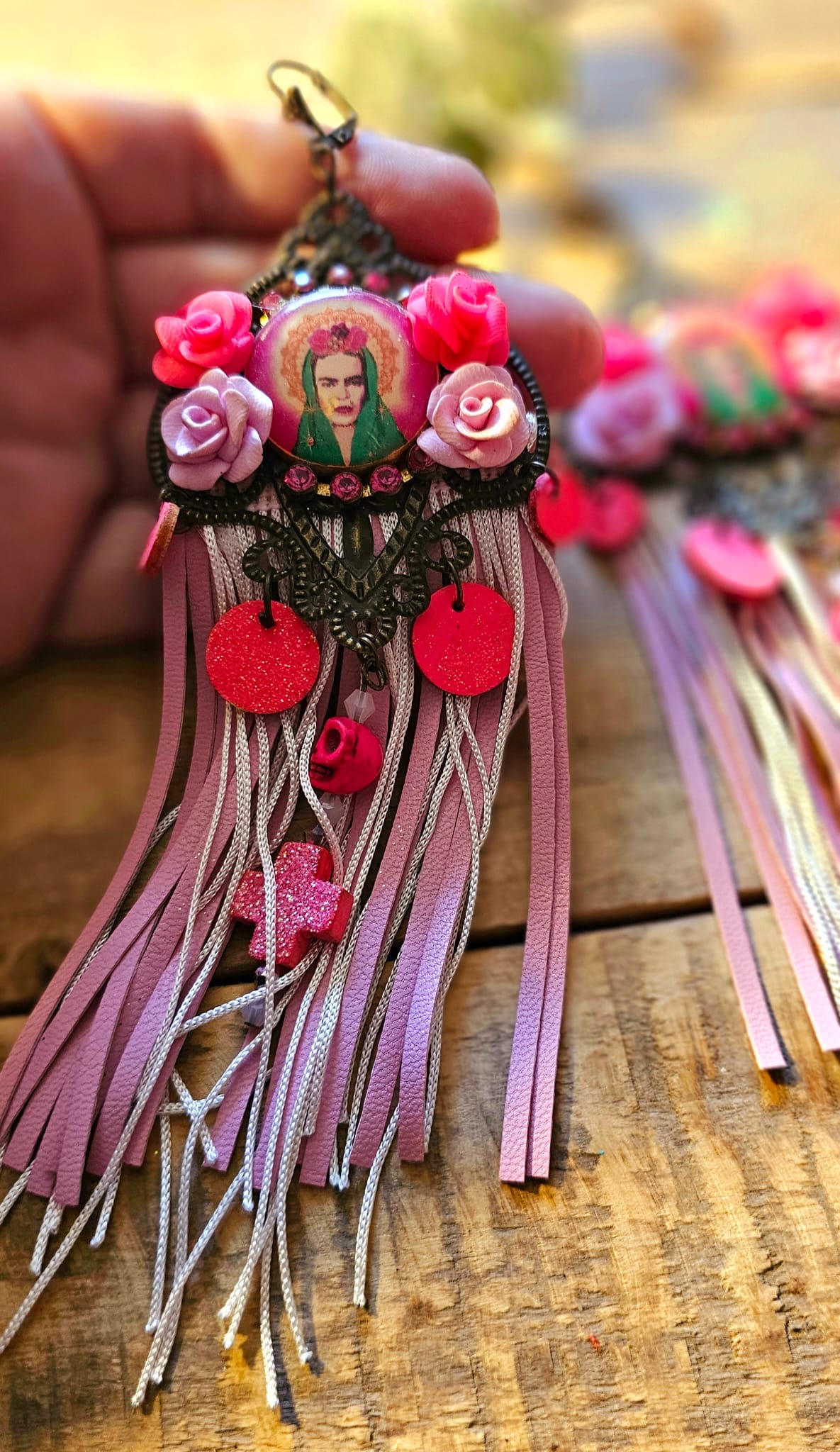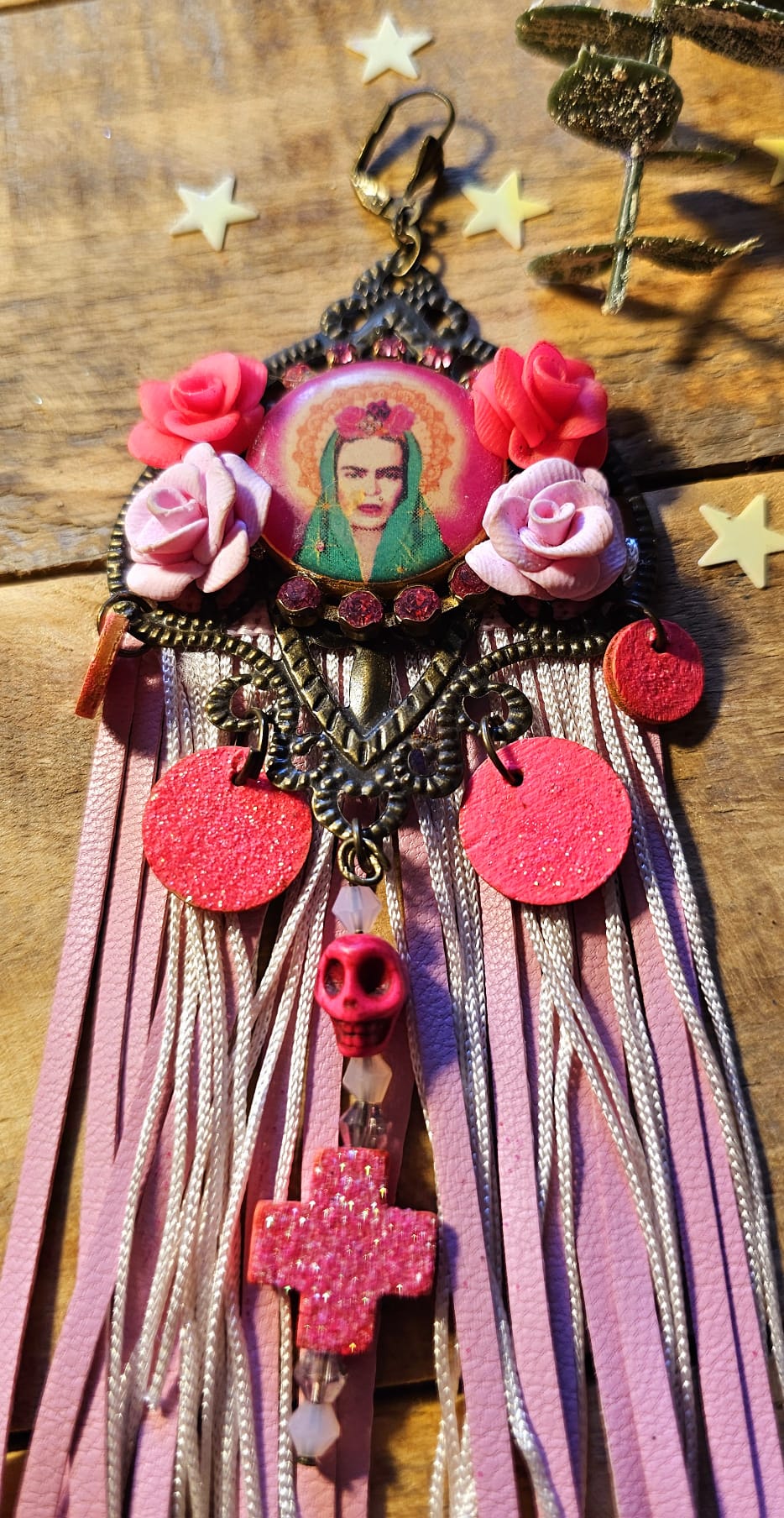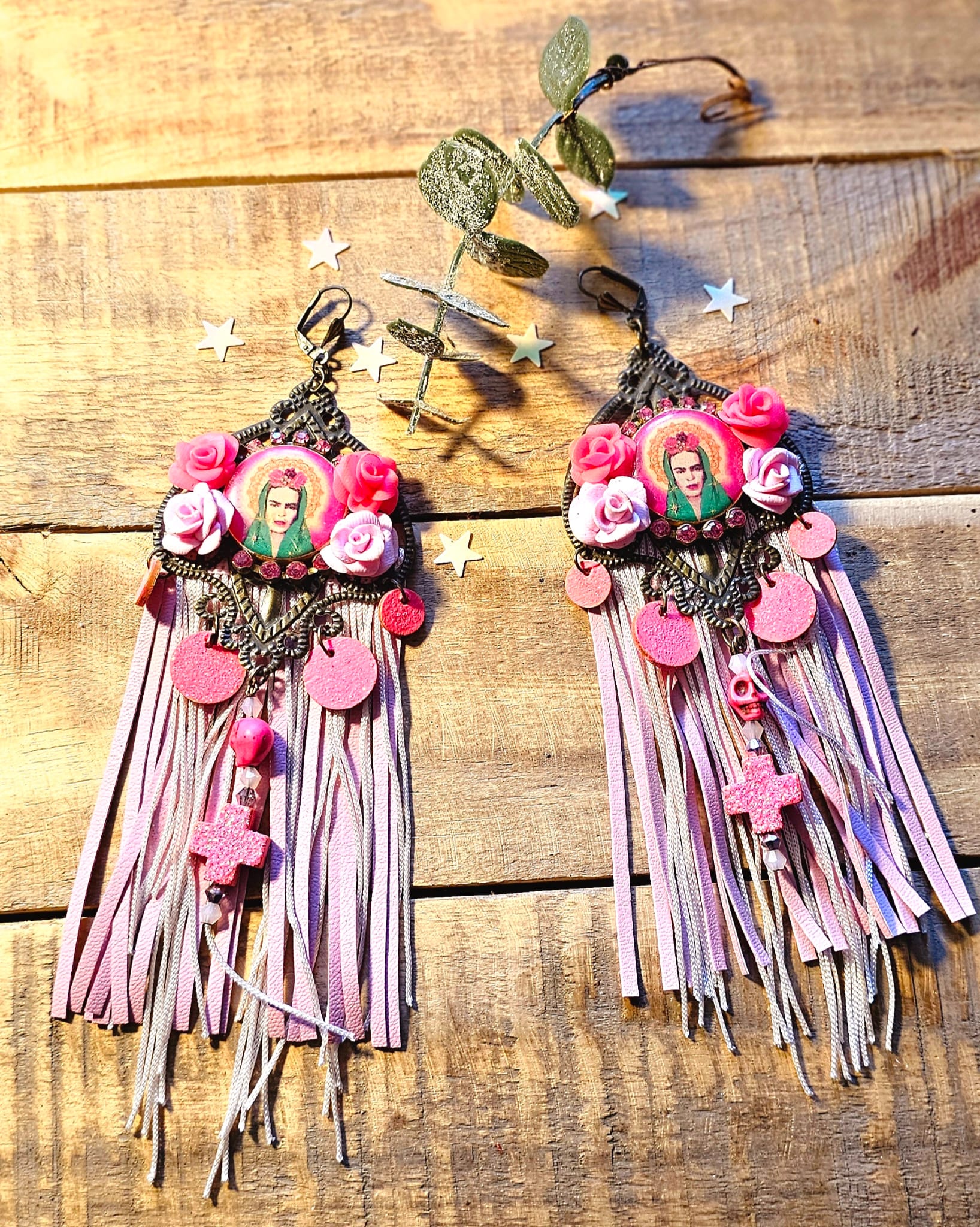 Les boucles d’oreilles I Love Frida 5 captivent par leur exubérance et leur raffinement artisanal. Un support en métal bronze accueille de délicates roses sculptées à la main en argile polymère, alternant entre un rose pâle doux et un rose fluo éclatant. Des franges en cuir et en soie, en nuances de rose et de blanc, apportent un mouvement fluide et aérien. Une croix et des pampilles, minutieusement peintes et pailletées à la main en rose fluo, ajoutent une touche vibrante. Une pastille en bois, ornée d’une image resinée Frida Vierge, signée Les Francines, parachève cette création audacieuse et ultra légère.