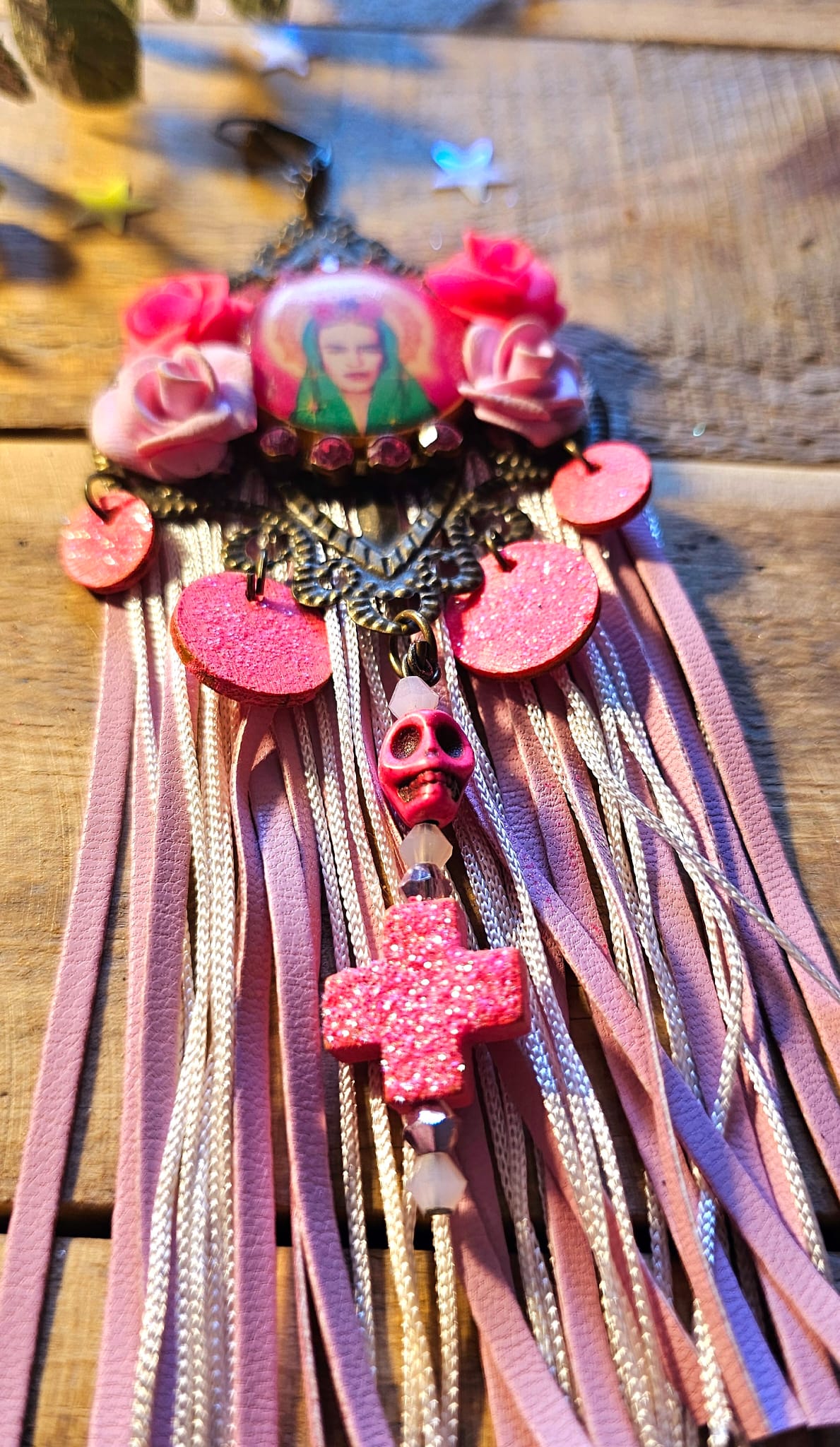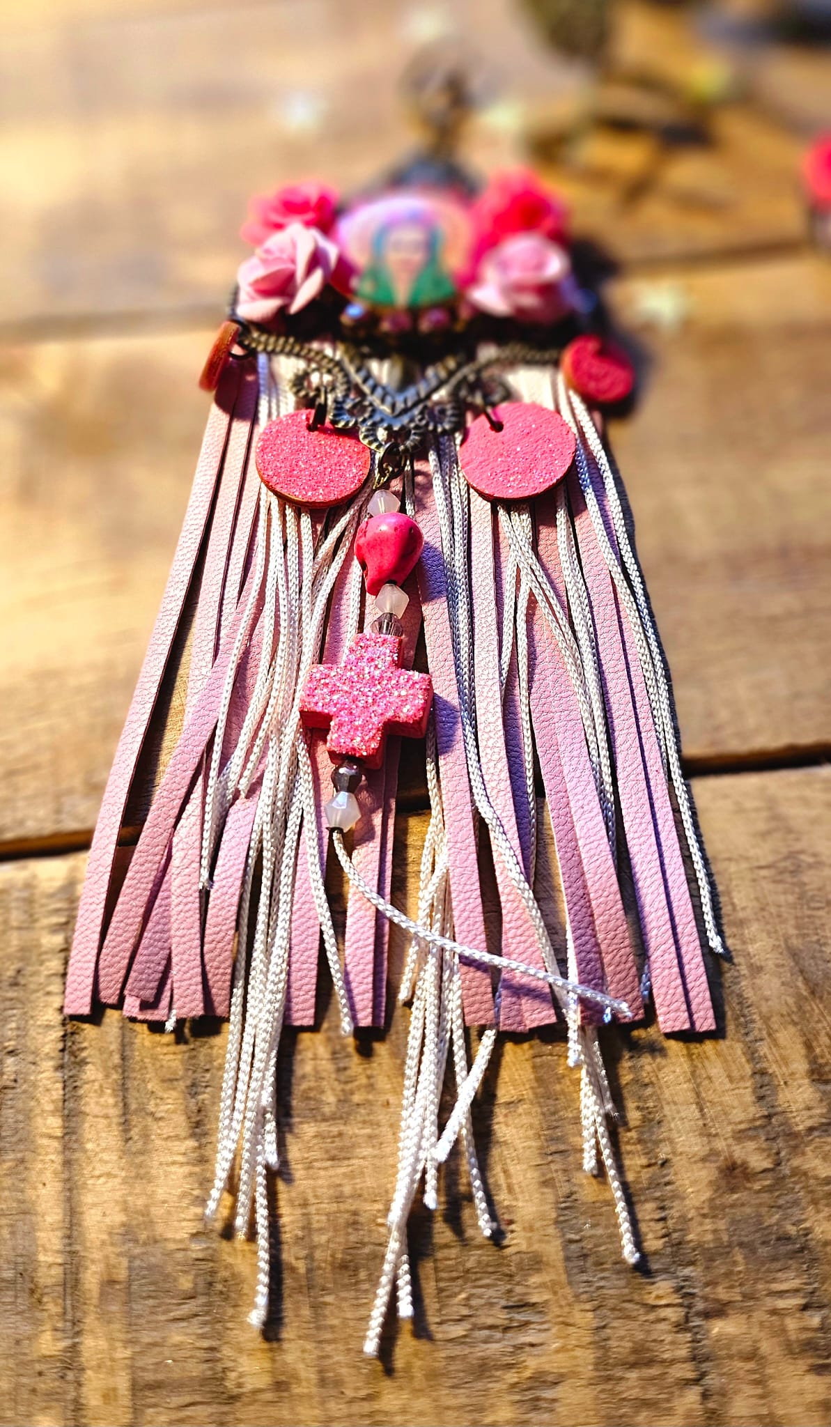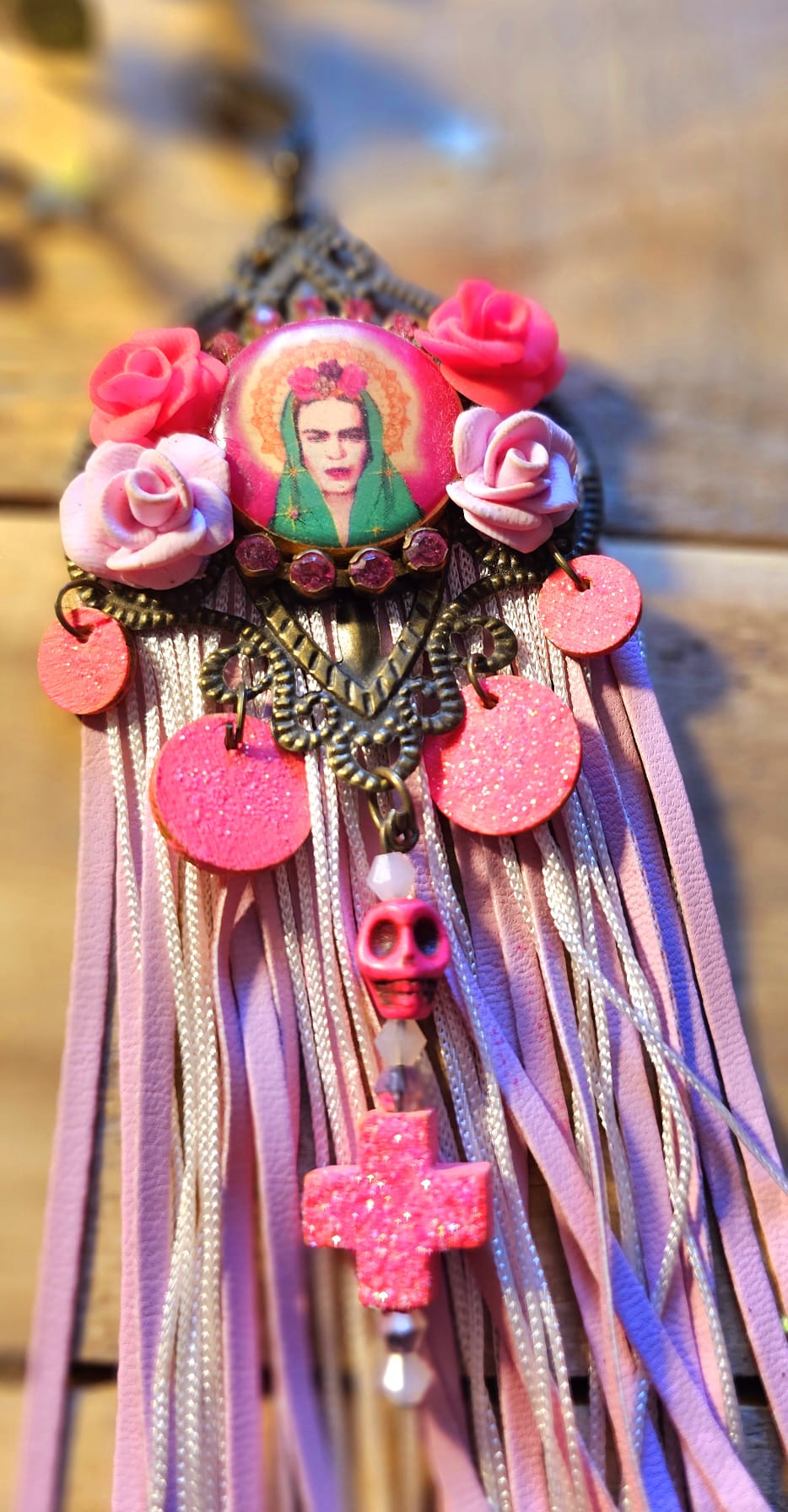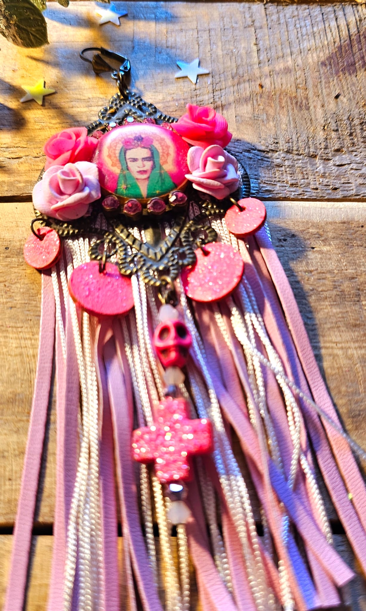 Les boucles d’oreilles I Love Frida 5 captivent par leur exubérance et leur raffinement artisanal. Un support en métal bronze accueille de délicates roses sculptées à la main en argile polymère, alternant entre un rose pâle doux et un rose fluo éclatant. Des franges en cuir et en soie, en nuances de rose et de blanc, apportent un mouvement fluide et aérien. Une croix et des pampilles, minutieusement peintes et pailletées à la main en rose fluo, ajoutent une touche vibrante. Une pastille en bois, ornée d’une image resinée Frida Vierge, signée Les Francines, parachève cette création audacieuse et ultra légère.
