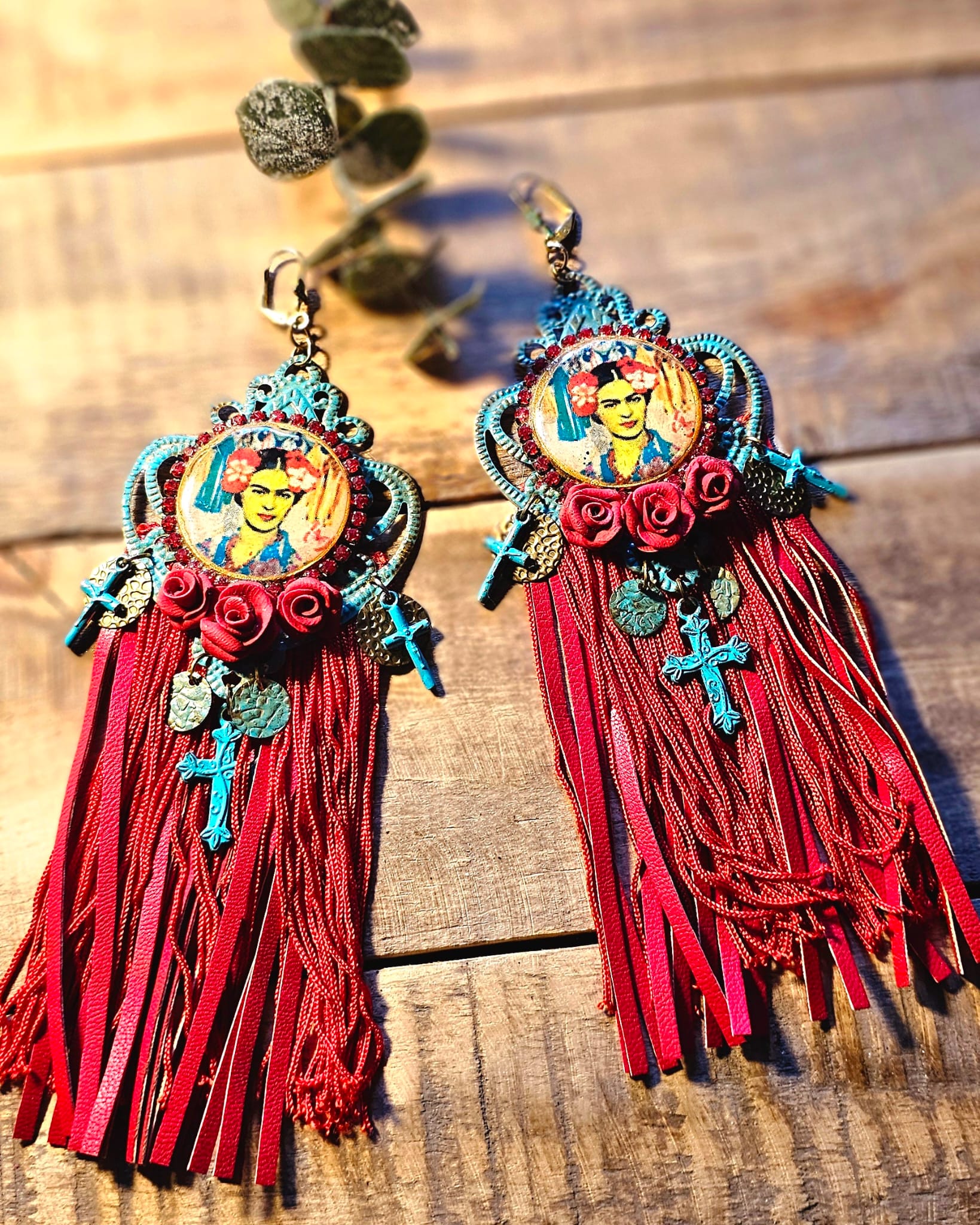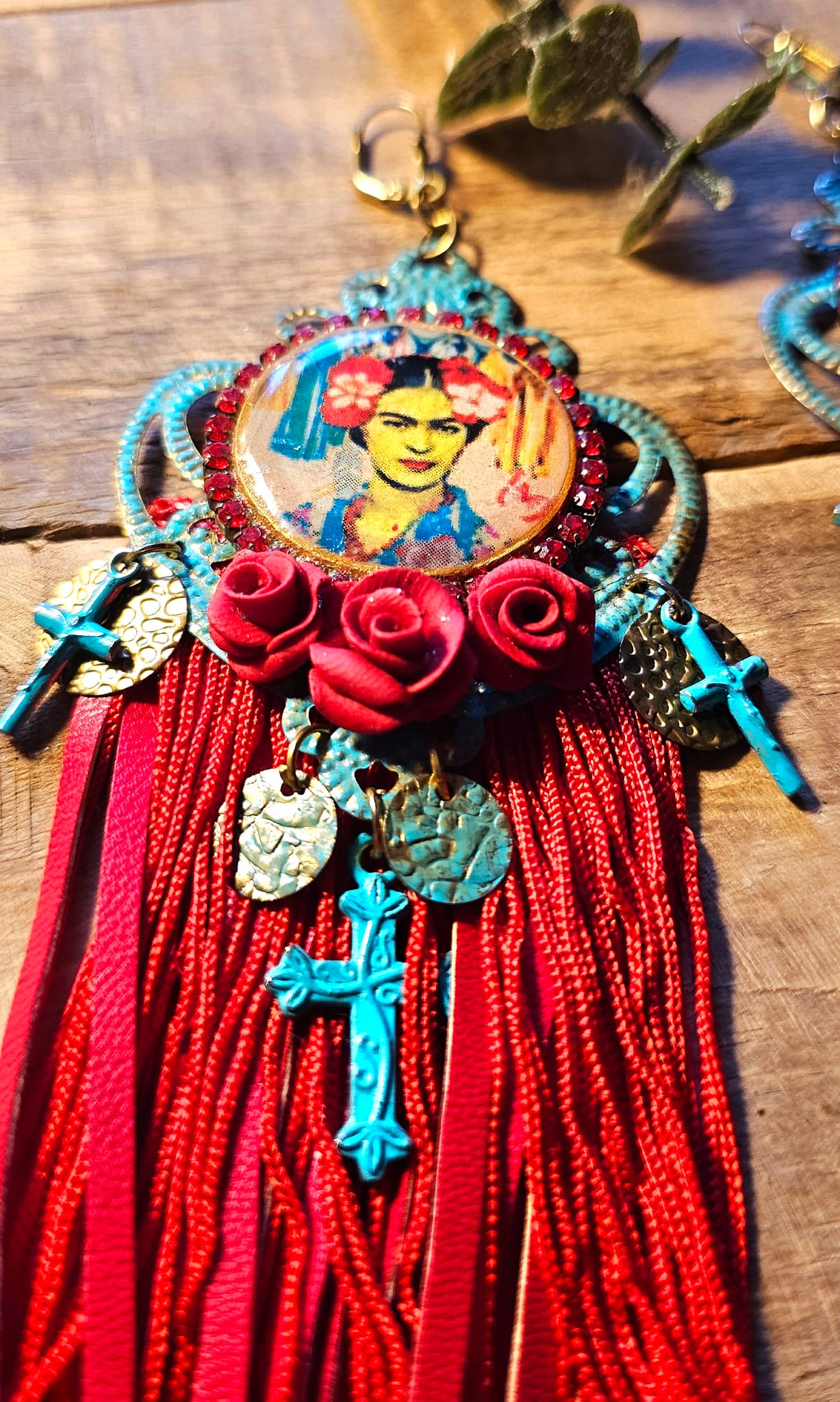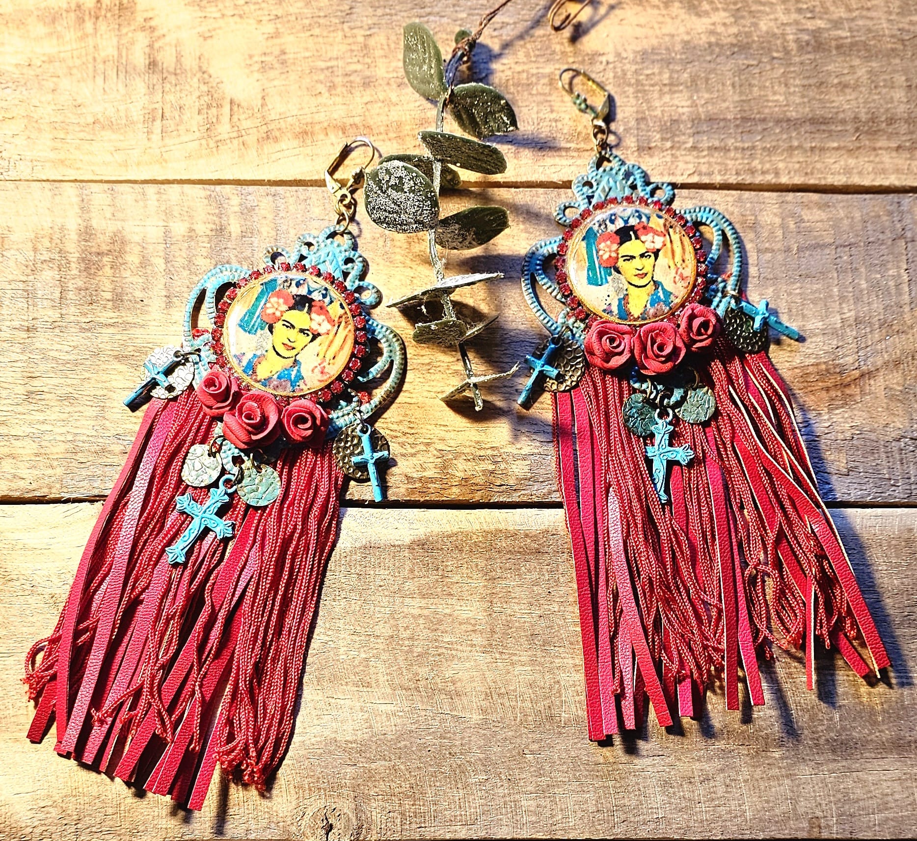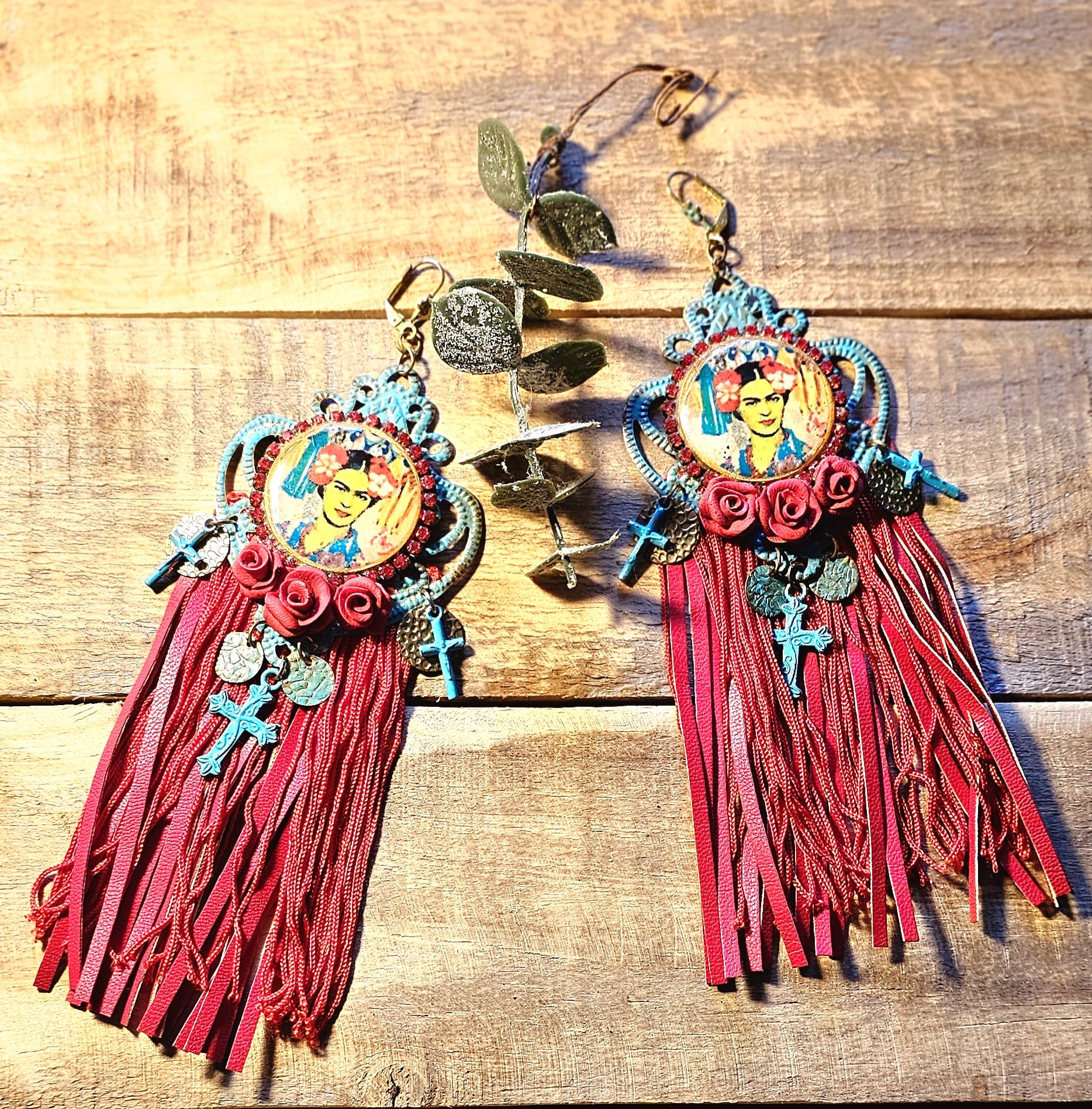Laissez-vous envoûter par l’intensité des boucles d’oreilles I Love Frida 7, une création artisanale mêlant élégance et caractère. Leur support en métal bronze, sublimé par une patine turquoise appliquée à la main, met en valeur de somptueuses pampilles peintes avec finesse. Des roses rouges, sculptées avec précision en argile polymère, apportent une touche romantique et vibrante. De longues franges en cuir et en soie rouge insufflent un mouvement fluide et élégant. Une pastille en bois ornée d’une image numérique resinée Frida Japon, signée Les Francines, parachève cette création d’exception, légère et raffinée.