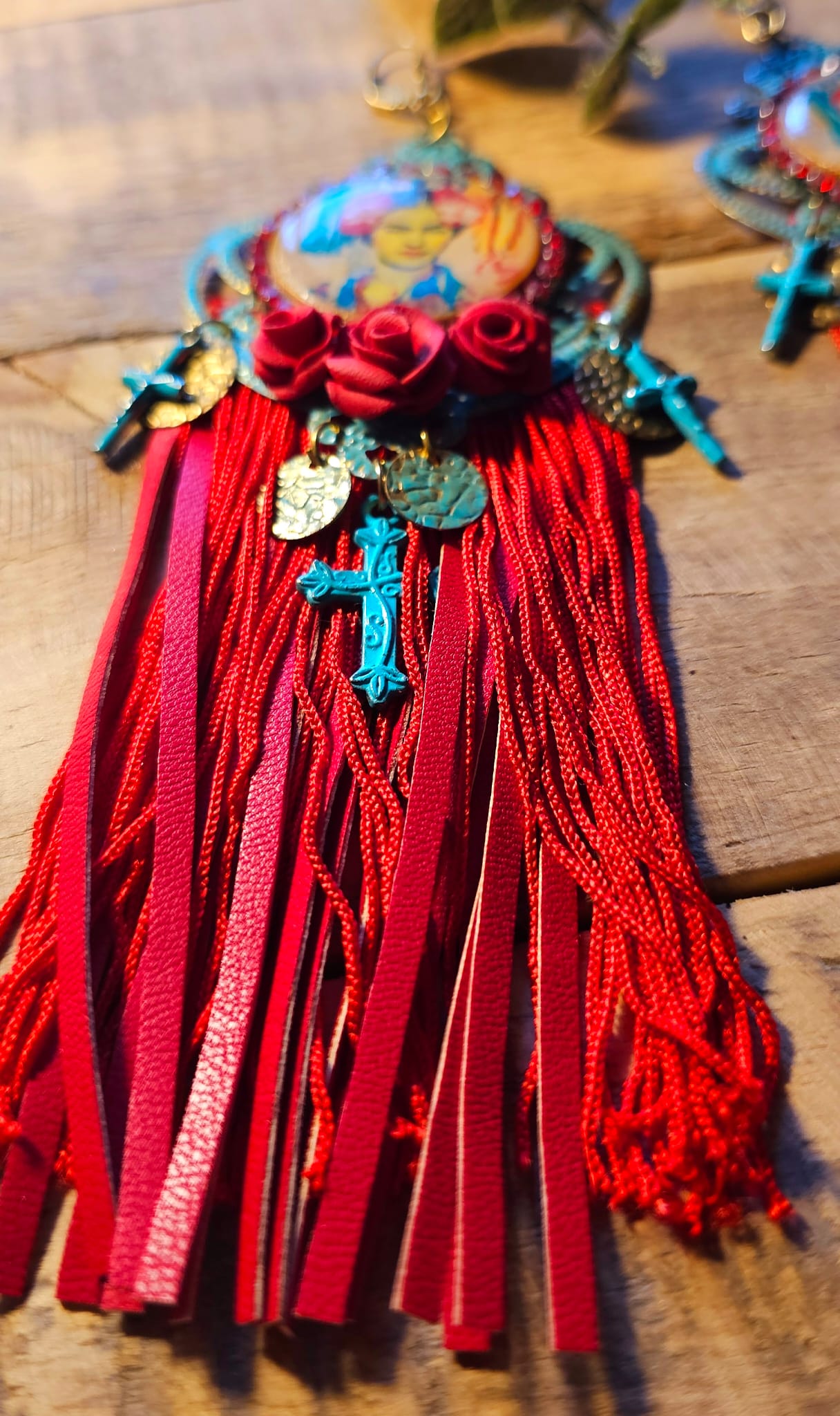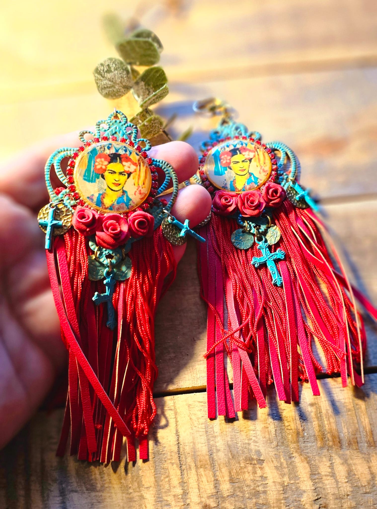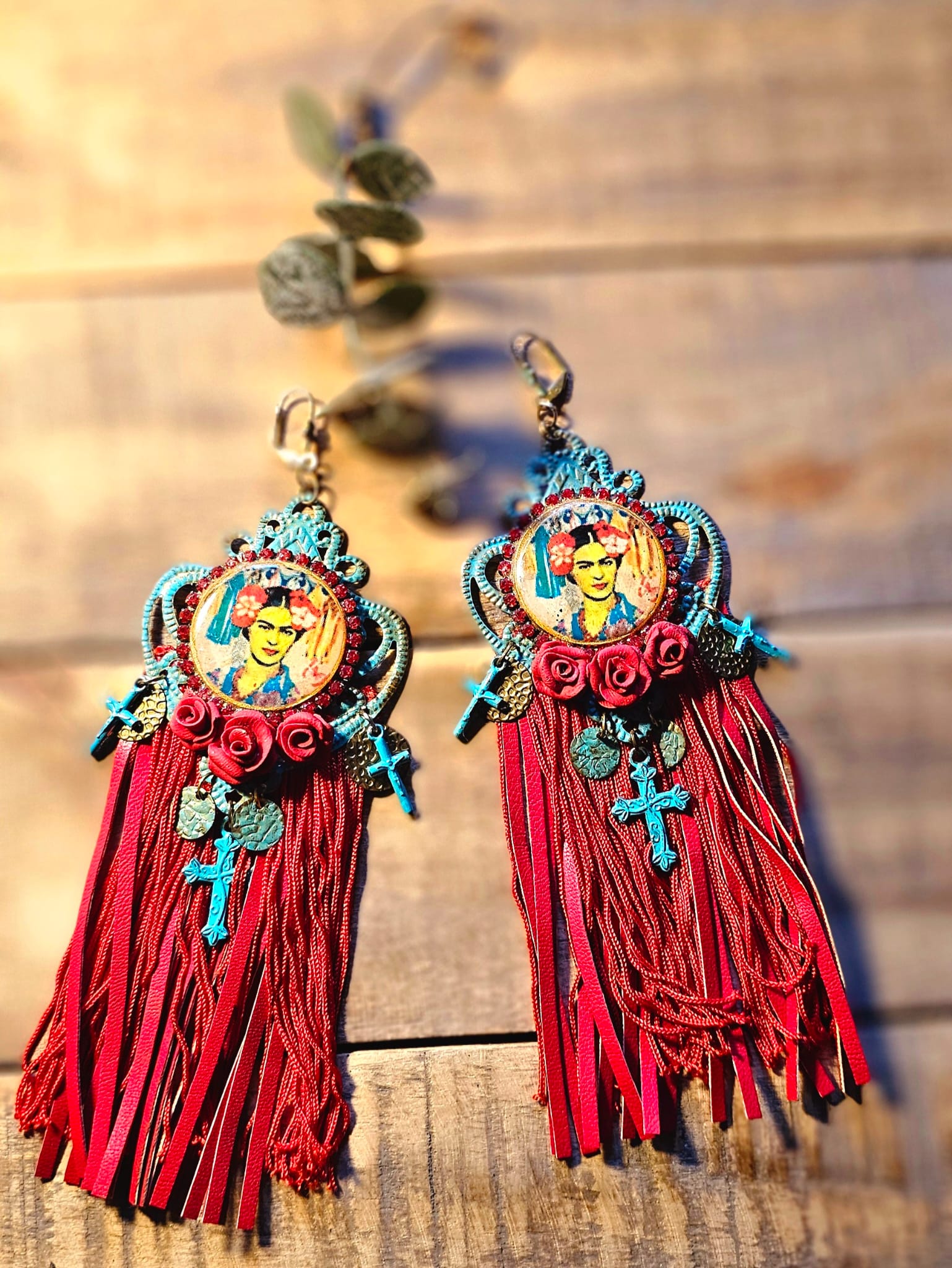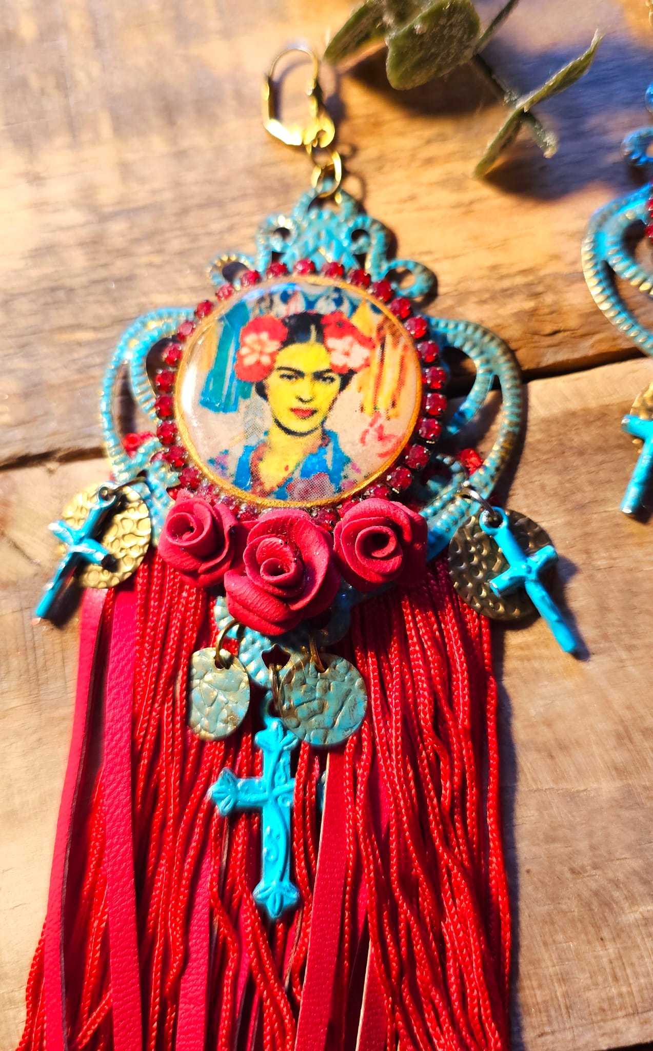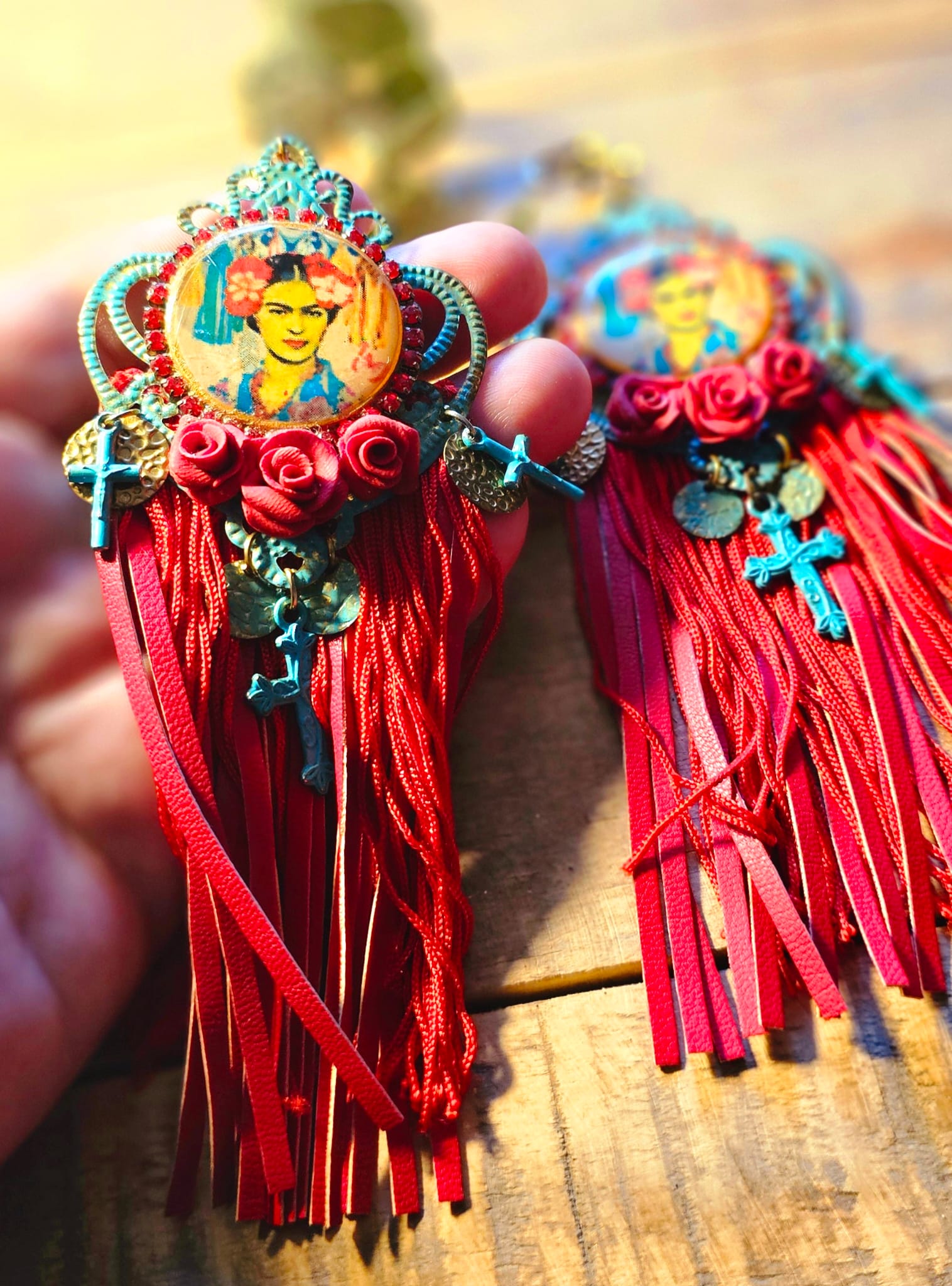 Laissez-vous envoûter par l’intensité des boucles d’oreilles I Love Frida 7, une création artisanale mêlant élégance et caractère. Leur support en métal bronze, sublimé par une patine turquoise appliquée à la main, met en valeur de somptueuses pampilles peintes avec finesse. Des roses rouges, sculptées avec précision en argile polymère, apportent une touche romantique et vibrante. De longues franges en cuir et en soie rouge insufflent un mouvement fluide et élégant. Une pastille en bois ornée d’une image numérique resinée Frida Japon, signée Les Francines, parachève cette création d’exception, légère et raffinée.