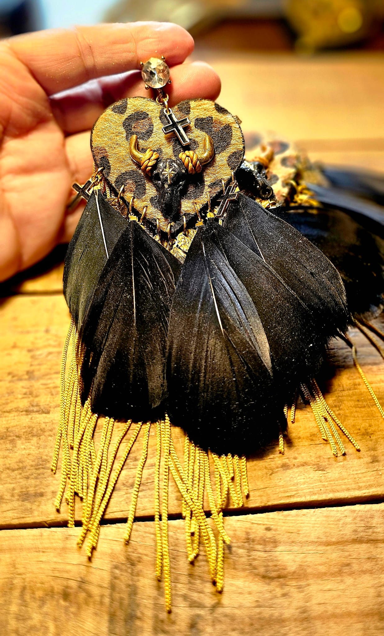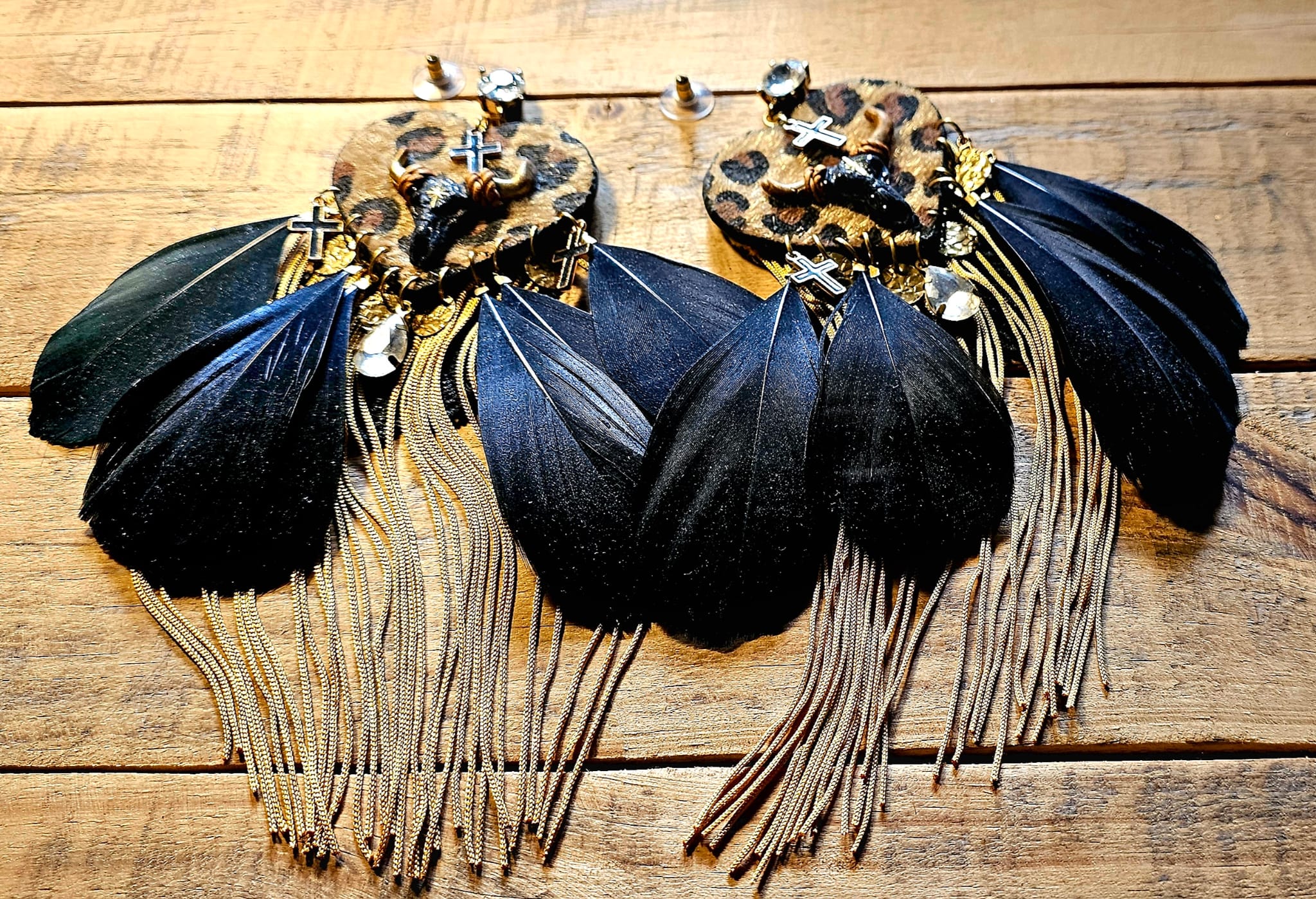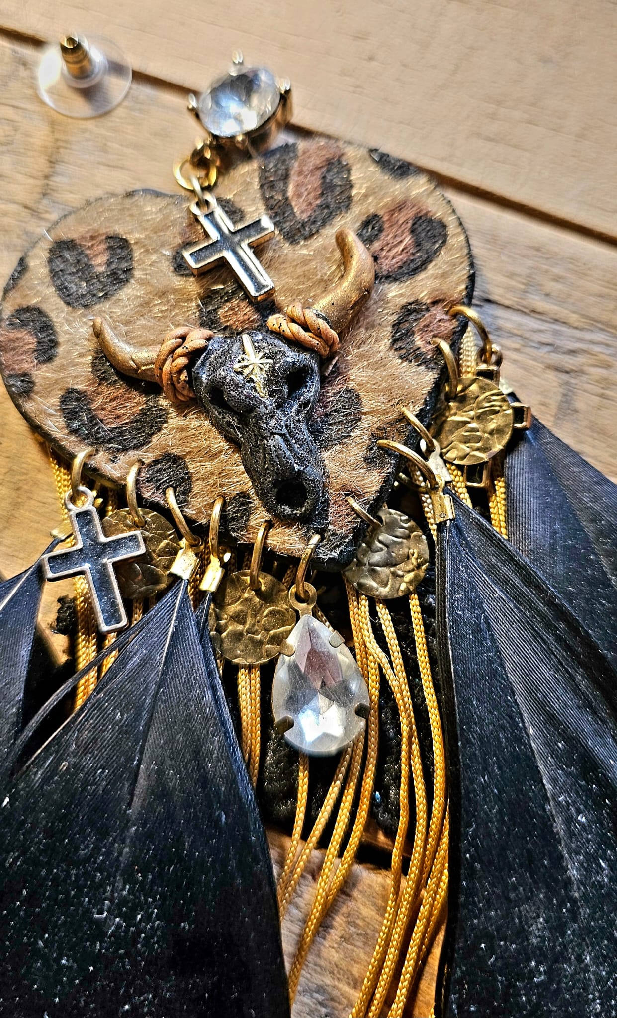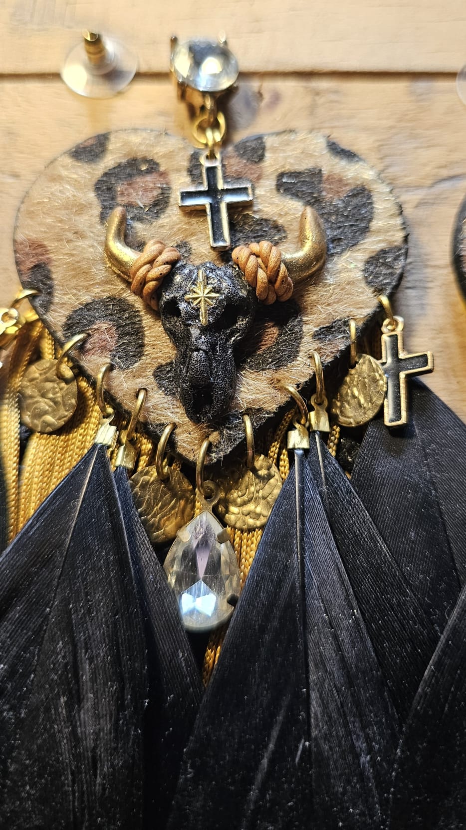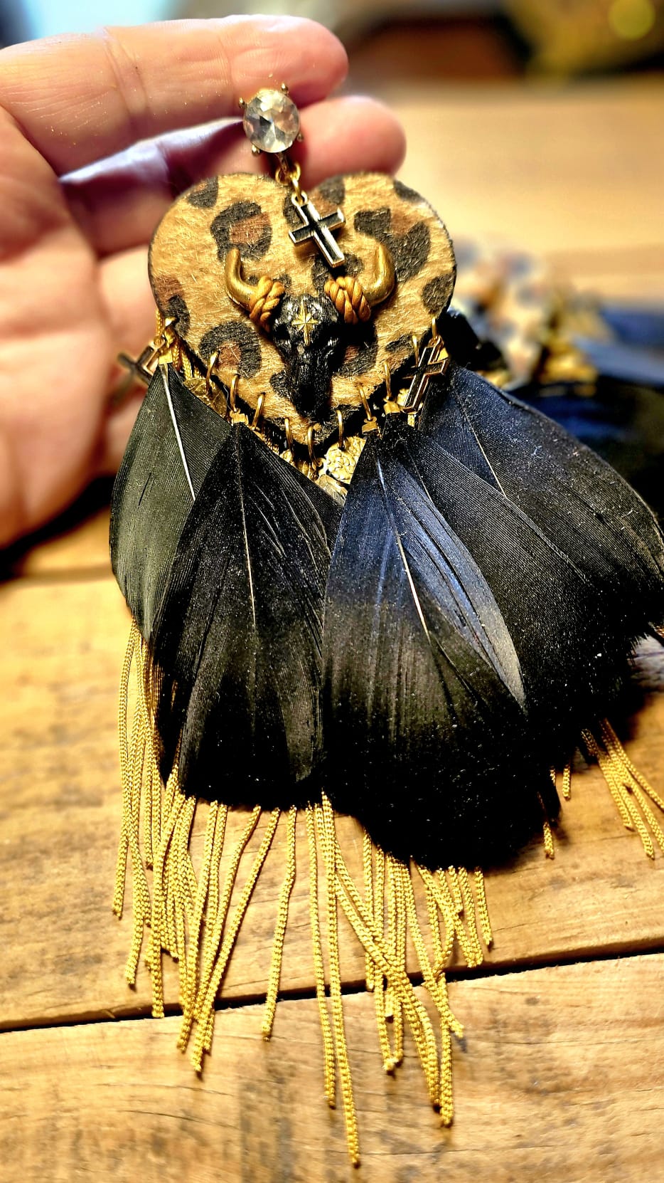 Matières : Cuir imprimé léopard, fourrure, argile polymère pailletée, plumes, strass en cristal blanc