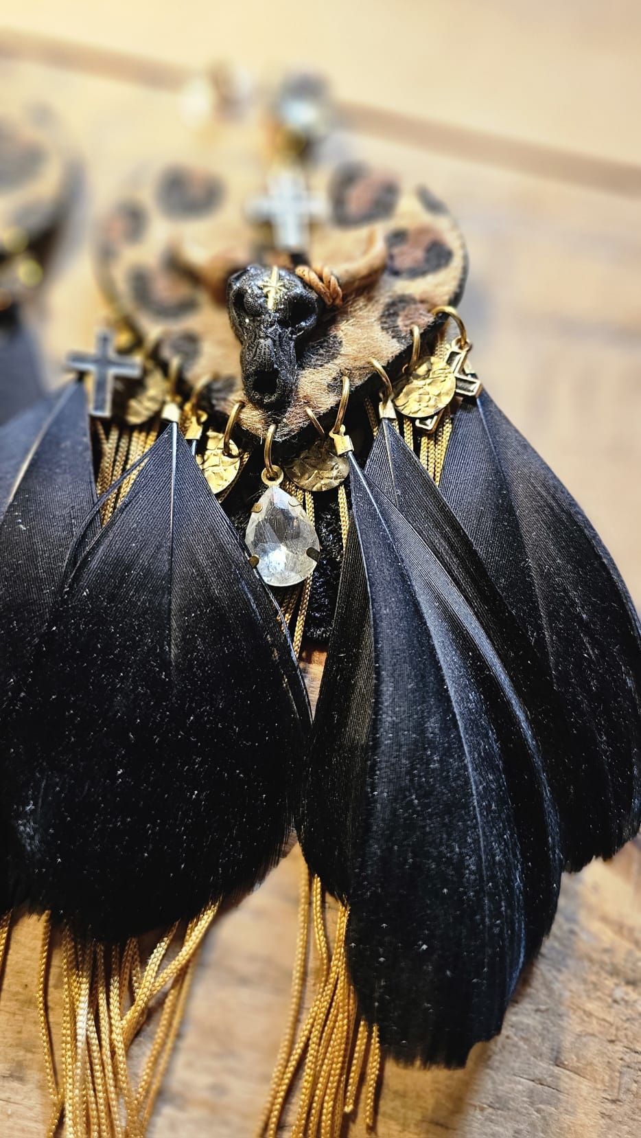 La sculpture en argile polymère, façonnée à la main et rehaussée de paillettes noir et or, confère une profondeur magnétique à ce bijou. Les plumes noires, légères et délicates, insufflent une dimension aérienne et dramatique, tandis que les strass en cristal blanc captent chaque rayon de lumière pour un éclat hypnotique. Avec ses nuances contrastées et son design résolument affirmé, I Love Skull est une pièce d’exception pour celles et ceux qui osent un style fort et inoubliable.